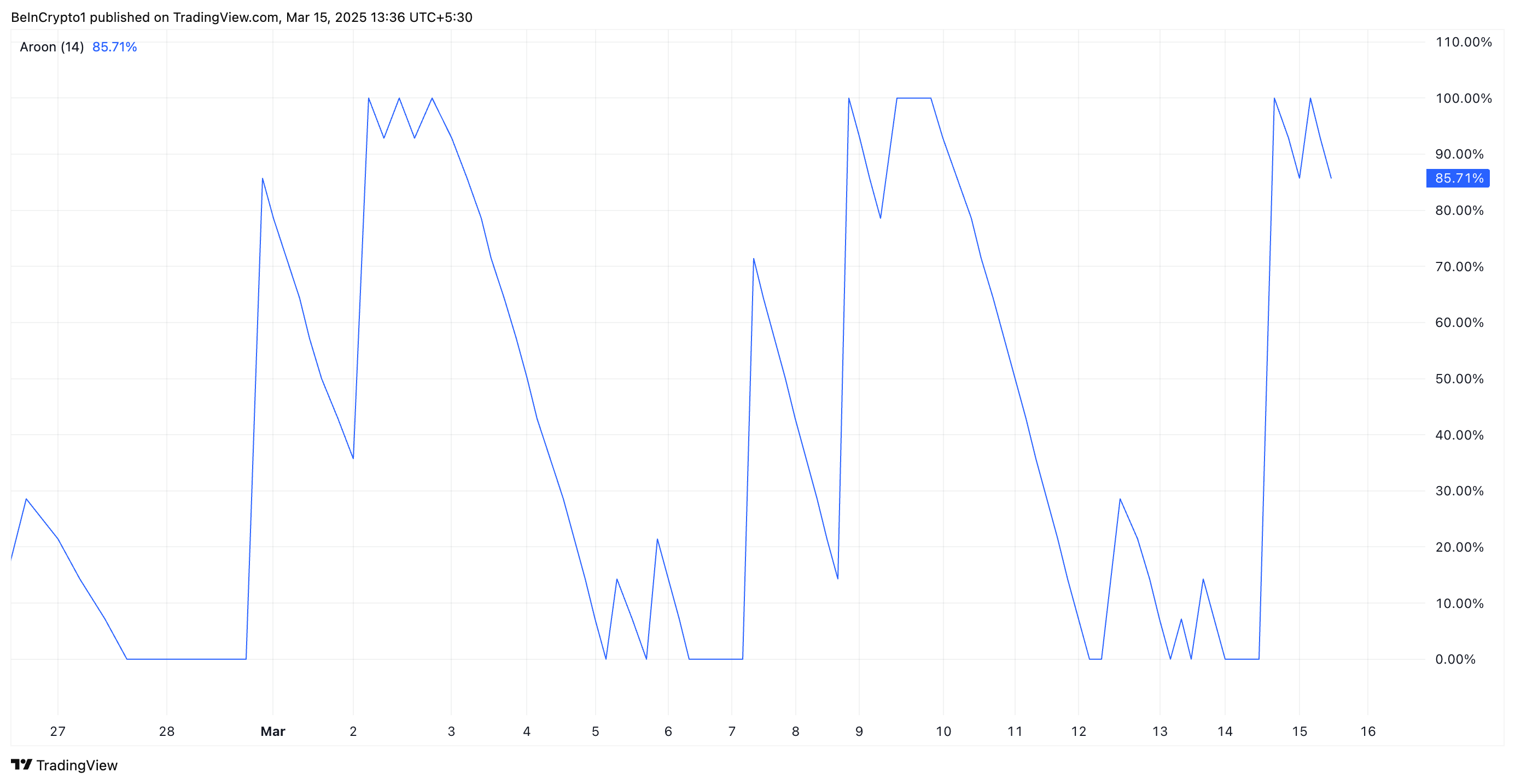 Kapag ang Aroon Down line ay nasa 100% o malapit dito, ito ay nagpapahiwatig ng malakas na bearish momentum. Kinukumpirma nito na ang kasalukuyang pagbaba ng PI ay malakas at ang selling pressure ay malaki.