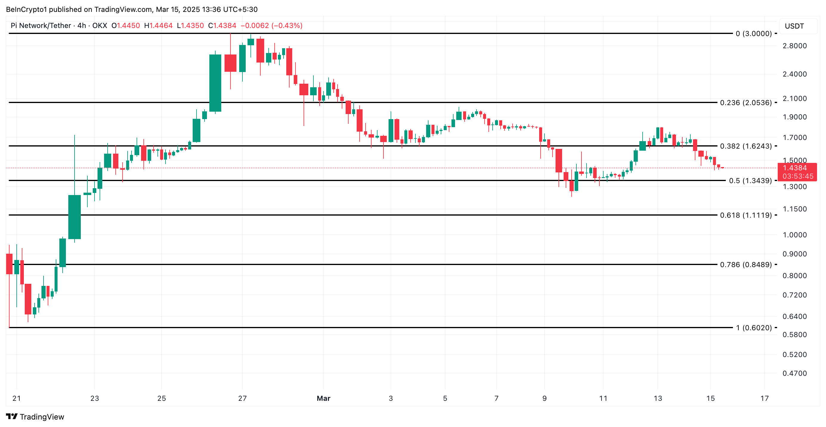 Sa kasalukuyan, ang PI ay nagte-trade sa $1.43, nakaposisyon sa ibabaw ng support na nabuo sa $1.34. Kung mas lumakas ang buying pressure, maaaring bumagsak ang PI sa ilalim ng support floor na ito at mag-trade sa $1.11, isang mababang presyo na huling naabot noong Pebrero 11.