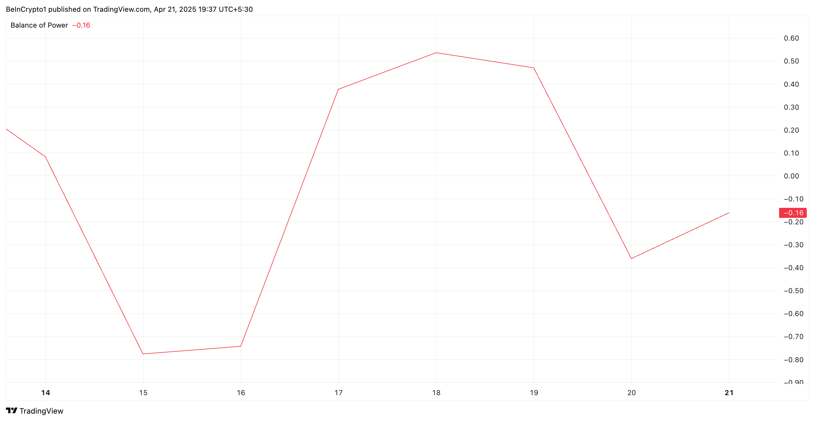 Ang BoP indicator ay sumusukat sa lakas ng buying kumpara sa selling pressure sa pamamagitan ng pag-compare ng close price sa trading range sa isang partikular na panahon. Kapag negative ang BOP tulad nito, ibig sabihin ay dominado ng sellers ang market, na nagpapahiwatig ng pababang pressure sa presyo ng asset.