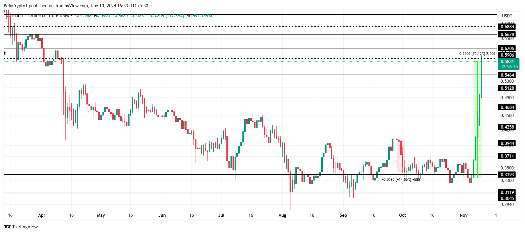 Ang presyo ng Cardano ay tumaas ng 75% sa nakalipas na limang araw, at nagte-trade ito sa $0.58 sa ngayon. Kung gusto ng ADA na lampasan ang $0.59 resistance at itulak pa ito patungo sa $0.60, kailangan nito ng patuloy na macroeconomic support at malakas na influx ng buying interest para mapanatili ang pace nito.