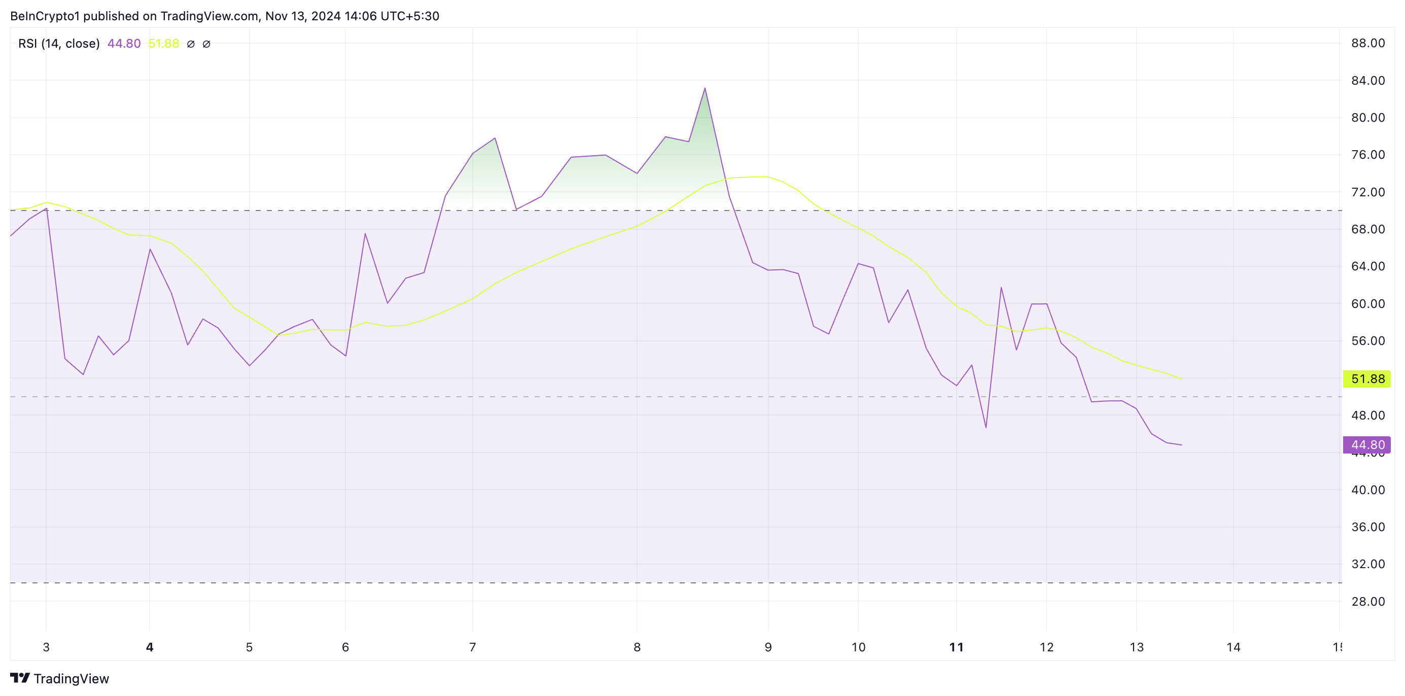 Ang RSI reading ng GRASS na 44.80 ay nagpapahiwatig na lumalakas ang selling pressure habang nagsisimula nang magbenta para kumita ang mga holders ng token.