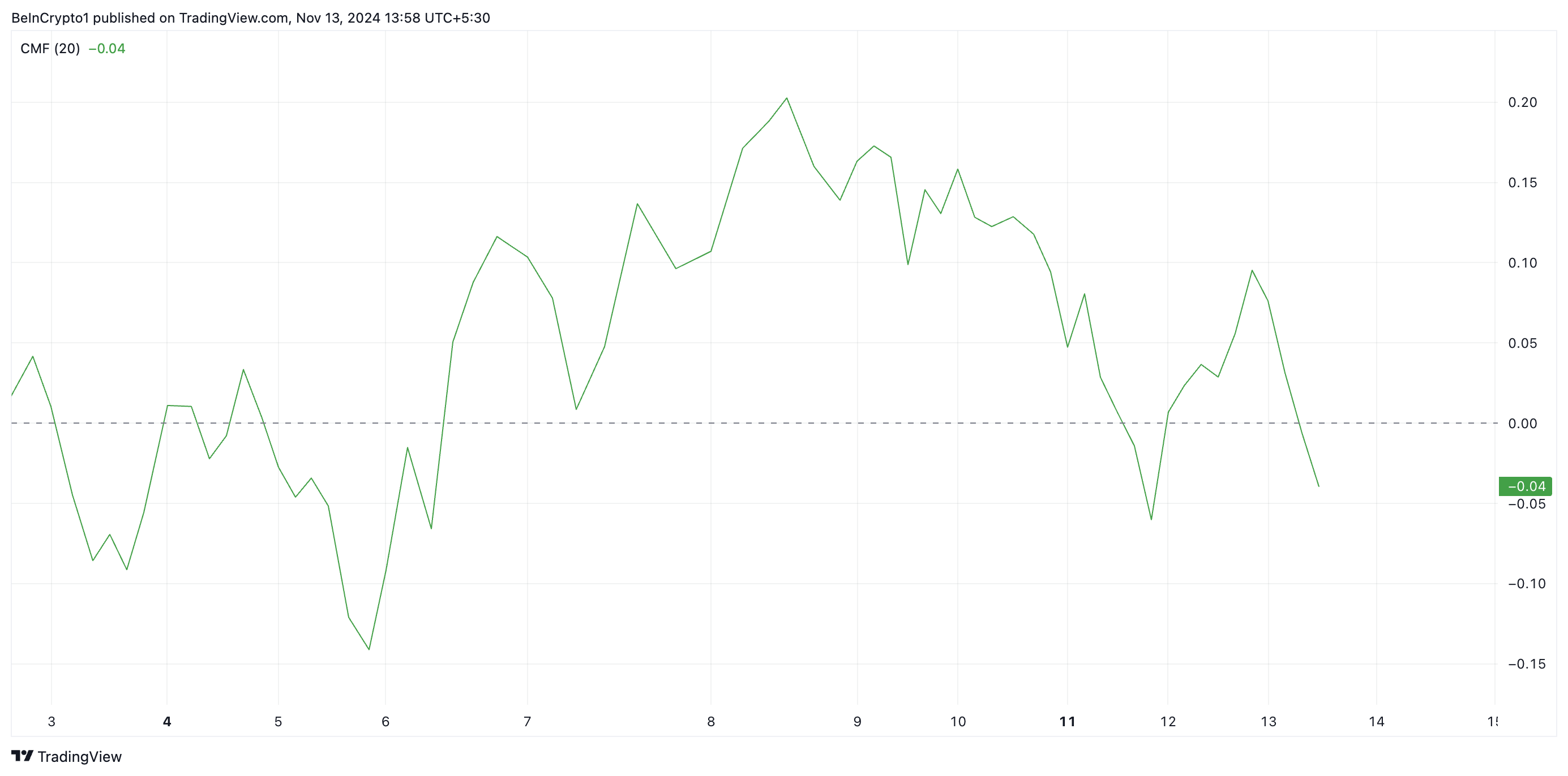 Bukod dito, ang negative Chaikin Money Flow (CMF) ng token ay nag-confirm ng bearish outlook. Sa ngayon, ang indicator na ito, na sumusukat sa money flows papasok at palabas ng isang asset, ay nasa ilalim ng zero sa -0.04.
