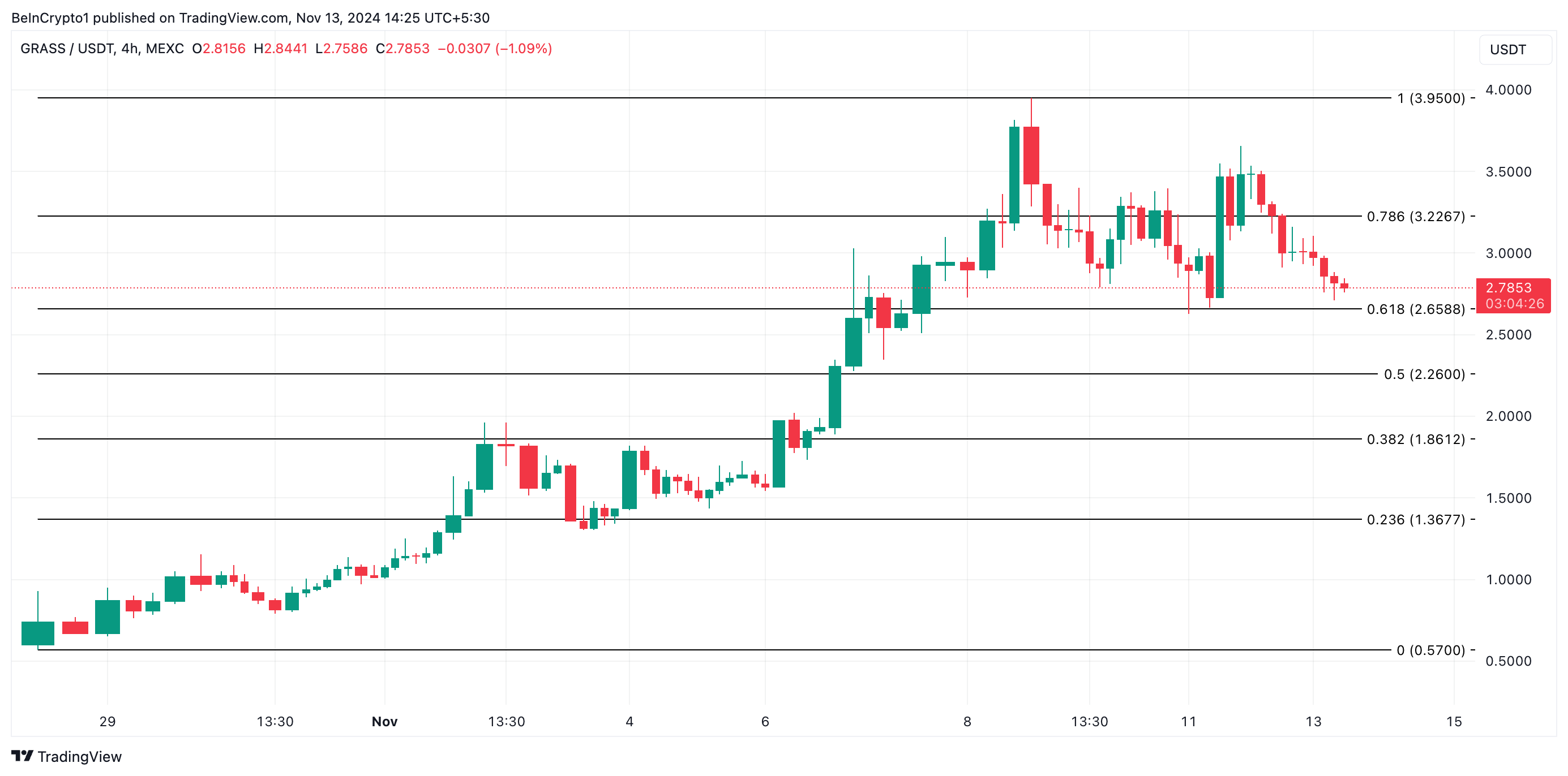 Sa ngayon, GRASS trades at $2.78, medyo mataas sa support na $2.65. Ang lumalakas na selling pressure ay nagpapahiwatig ng potential break sa ibaba ng level na ito.