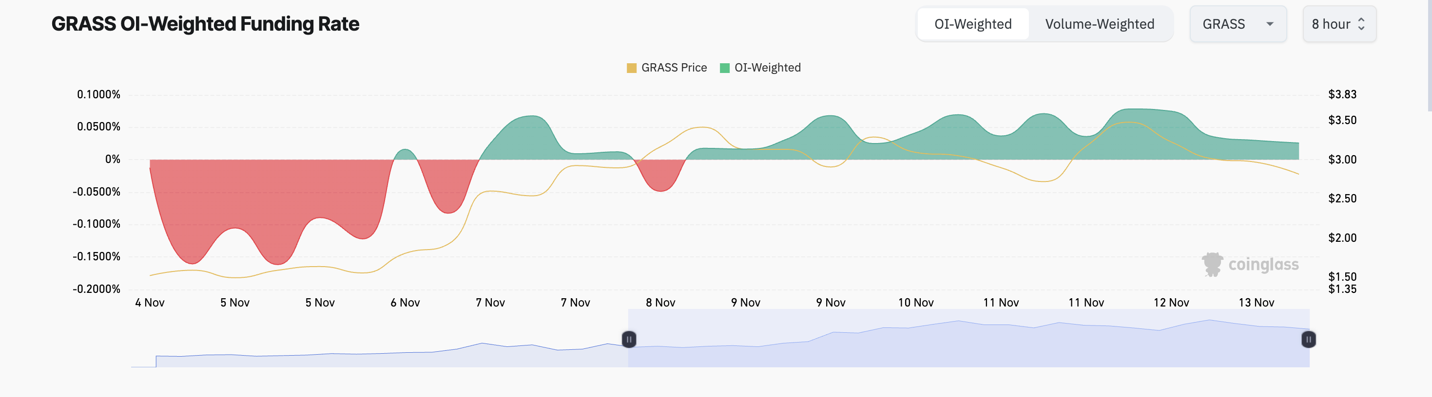 Kahit na bumaba ang presyo ng GRASS token, patuloy pa rin ang mga futures traders na tumaya sa pabor ng price rebound. Ito ay makikita sa funding rate ng token, na nanatiling positive mula pa noong November 8. Sa ngayon, ito ay 0.025%, ayon sa data ng Coinglass.