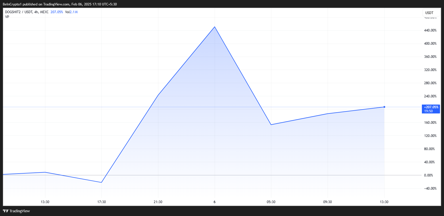 Sa kabila ng pagtanggi ng Burwick, patuloy na nakakaakit ng interes ng mga investor ang DOGSHIT2. Sa rurok nito noong Enero 31, ang market capitalization ng token ay lumampas sa $23 milyon. Habang bumaba ito sa humigit-kumulang $8.2 milyon, ayon sa CoinGecko data, tumaas ang presyo ng mahigit 200% mula nang magbukas ang session noong Huwebes.