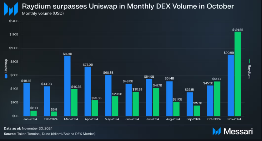 Ayon sa isang report ng Messari, nakapagtala ang Raydium ng $124.6 billion sa DEX volume noong November 2024, na mas mataas ng 30% kumpara sa $90.5 billion ng Uniswap. Ipinapakita nito ang mabilis na pag-angat ng ecosystem ng Solana at ang lumalaking prominence ng meme coin trading.