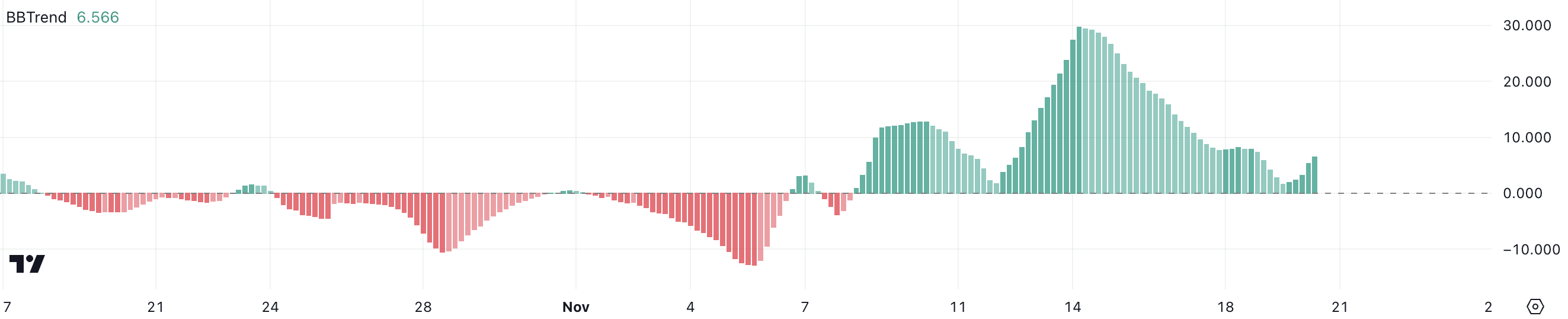 Sinusukat ng BBTrend ang lakas at direksyon ng isang trend sa pamamagitan ng pag-analyze ng Bollinger Bands, kung saan ang positibong halaga ay nagpapahiwatig ng uptrend at ang negatibong halaga ay nagpapahiwatig ng downtrend.