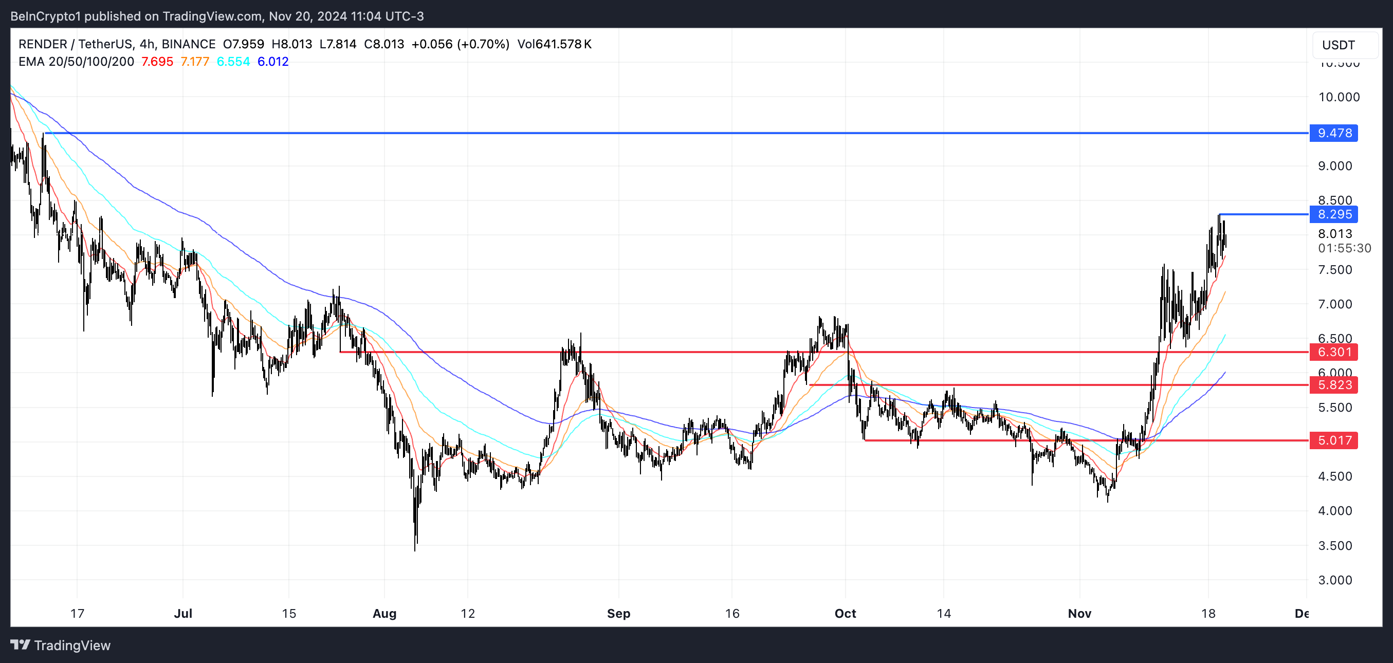 Ang EMA lines ng RENDER ay kasalukuyang nagpapakita ng bullish setup, kung saan ang short-term lines ay nasa itaas ng long-term ones at ang presyo ay nagte-trade sa itaas ng lahat ng ito.