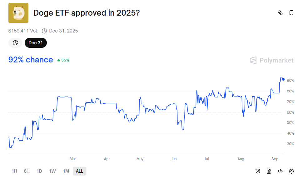 Ipinapakita ng prediction market na Polymarket na sa Setyembre, umabot sa bagong high na mahigit 90% ang probability ng DOGE ETF approval — ang pinakamataas na level ngayong taon.