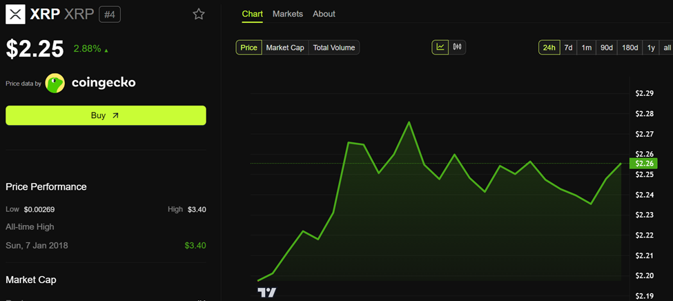 Matapos ang balitang ito, tumaas ng halos 3% ang presyo ng XRP sa nakalipas na 24 oras at nasa $2.25 ang trading price nito sa ngayon. Ayon sa data ng CoinGecko, ipinapakita na ang XRP ang pinakamagandang performance sa top 18 crypto assets.