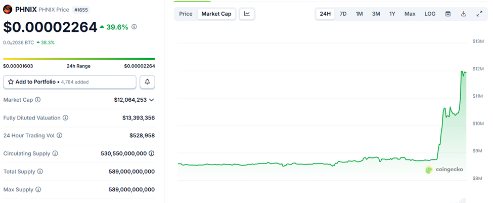 Agad na tumaas ang PHNIX token ng halos 40% at nag-trade sa $0.00002264 sa kasalukuyan.