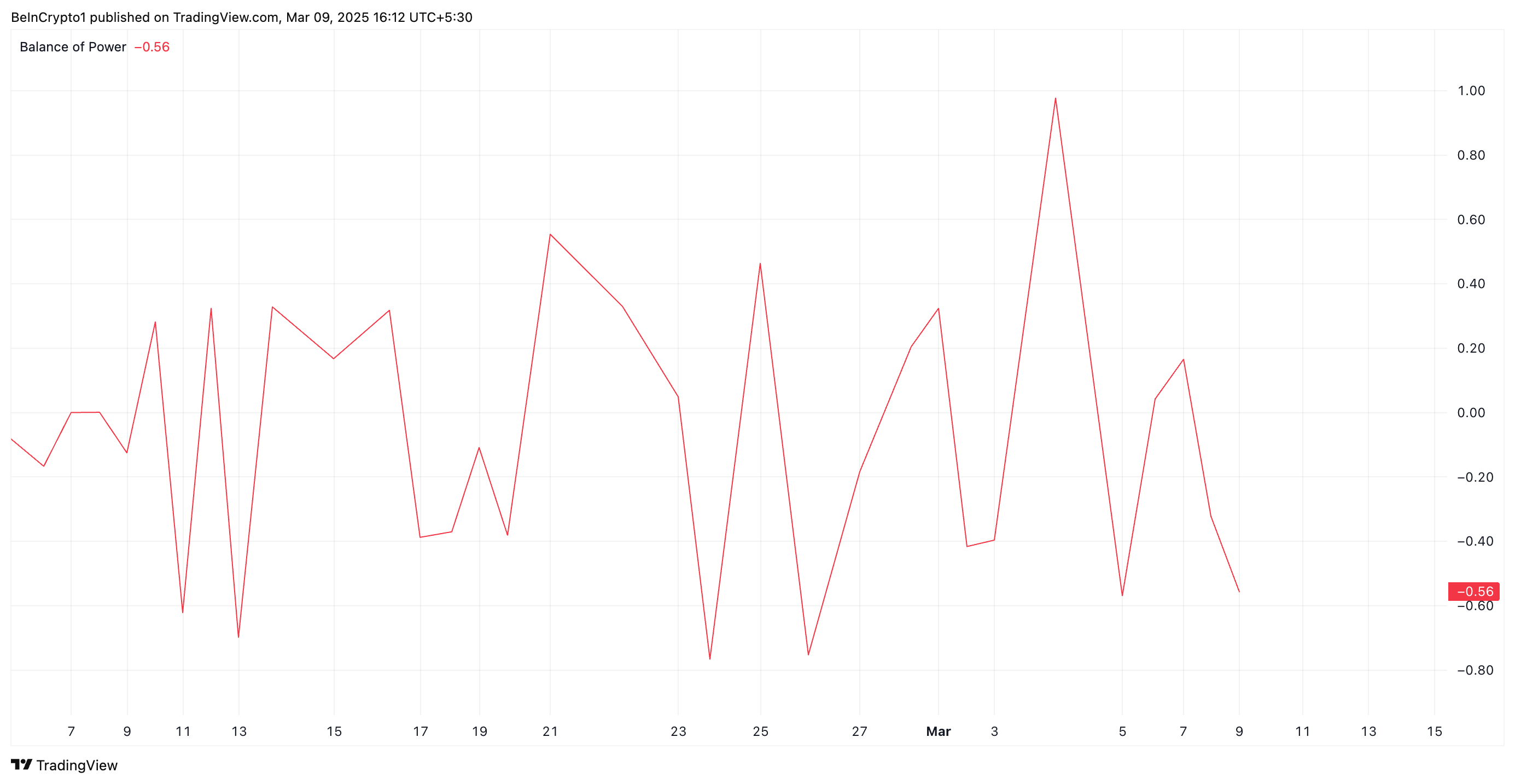 Ang BoP indicator ng isang asset ay nagko-compare ng lakas ng buyers at sellers sa pamamagitan ng pag-aanalyze ng price movements sa loob ng isang yugto. Kapag negatibo ang value nito, nangangahulugan ito na mas may kontrol ang sellers, ibig sabihin mas malakas ang downward pressure, at malamang na nakakaranas ng bearish trend ang asset.