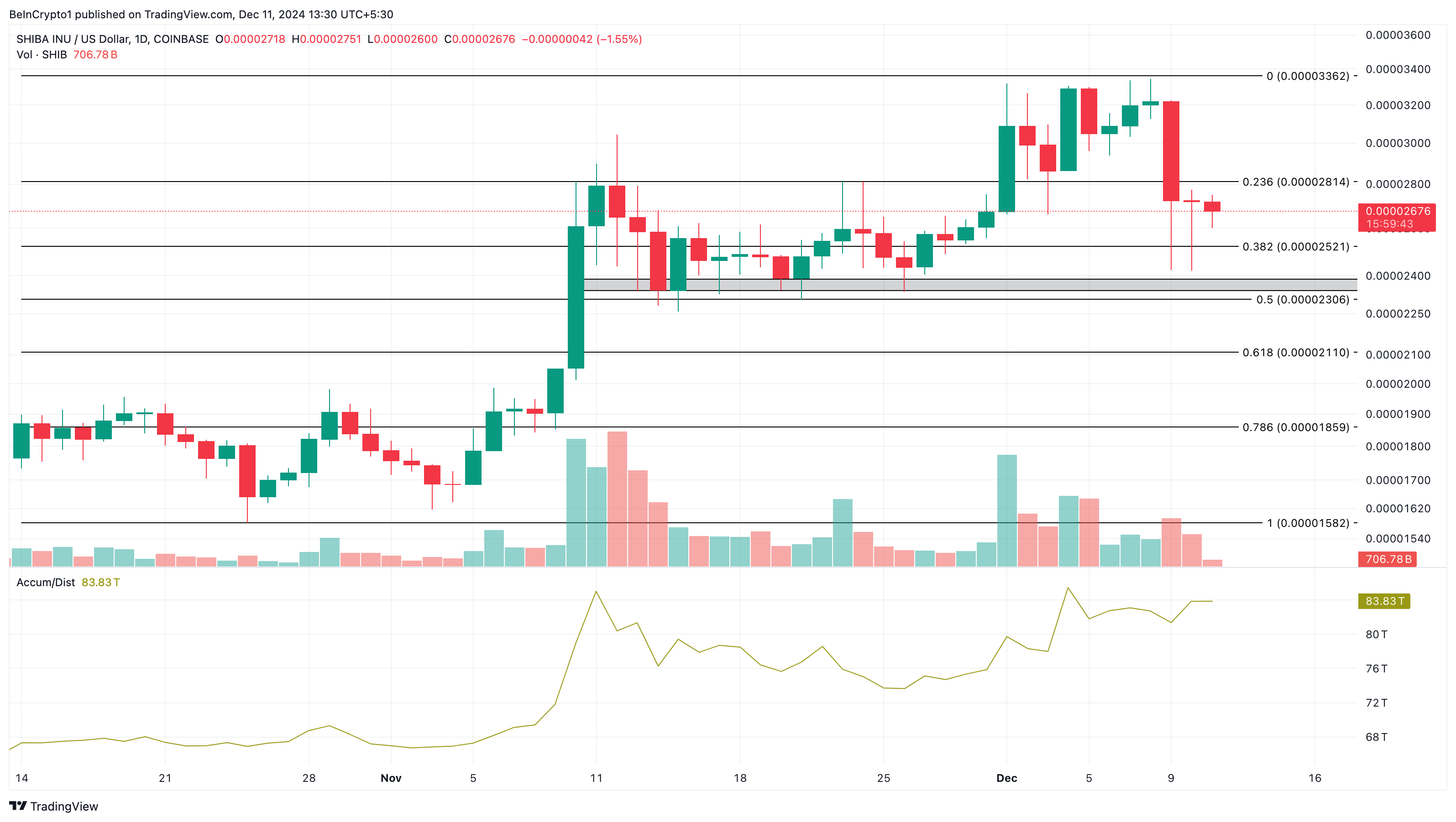 Kapag bumaba ang reading, ibig sabihin mas mataas ang selling pressure kaysa accumulation. Sa kabilang banda, ang pagtaas ng A/D ay nagpapahiwatig ng tumataas na buying pressure, na siyang nangyayari sa SHIB. Pero, kailangan ng mga bulls na i-defend ang support sa $0.000024 para ma-validate ang thesis na ito.