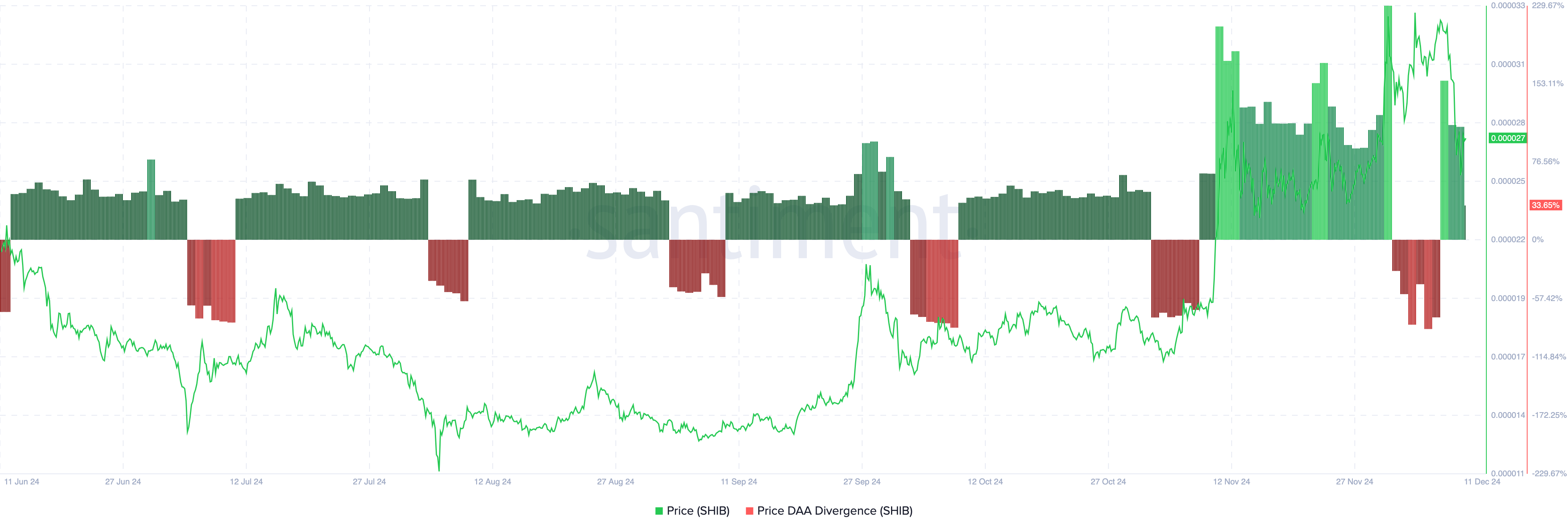 Ayon sa Santiment data, tulad ng ipinapakita sa itaas, ang price-DAA divergence ng SHIB ay umabot na sa 33.65%. Kung magpapatuloy ang trend na ito, posibleng lumampas ang presyo ng SHIB sa $0.000027 sa mga susunod na araw.