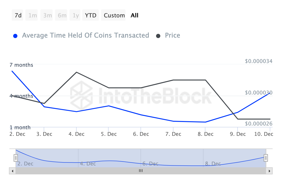 Historically, kapag nahihirapan ang mga SHIB holders na hindi magbenta, bumabagsak nang malaki ang presyo — kadalasan, mas mababa pa sa recent na 11% na pagbaba. Pero ayon sa IntoTheBlock, tumataas ang Coins Holding Time ng SHIB simula noong December 8.