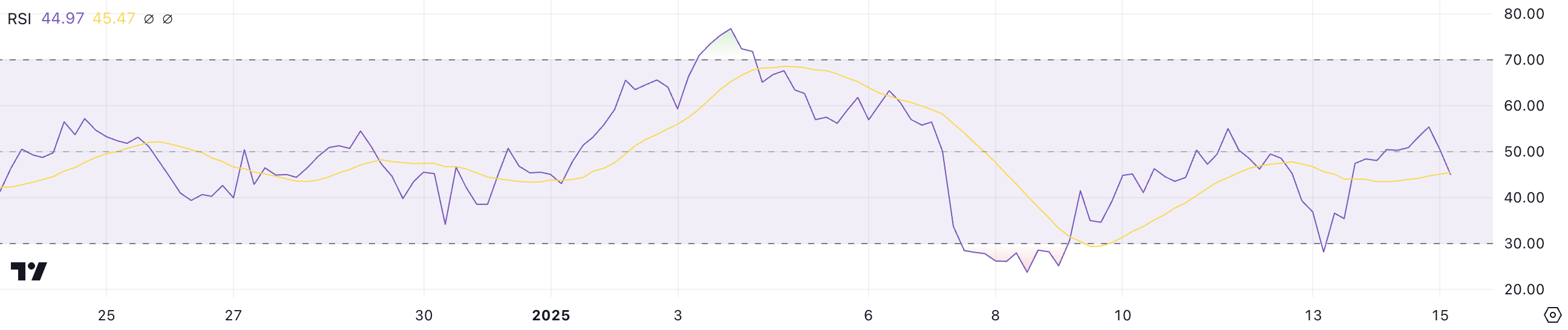 Shiba Inu RSI nasa 44.9, bumabawi mula sa oversold level na 28 noong January 13 at pansamantalang umabot sa 55 kanina. Ang neutral-to-slightly bearish reading na ito ay nagsa-suggest ng balanse sa pagitan ng buying at selling pressure, na walang malakas na momentum na nagtutulak sa presyo ngayon.