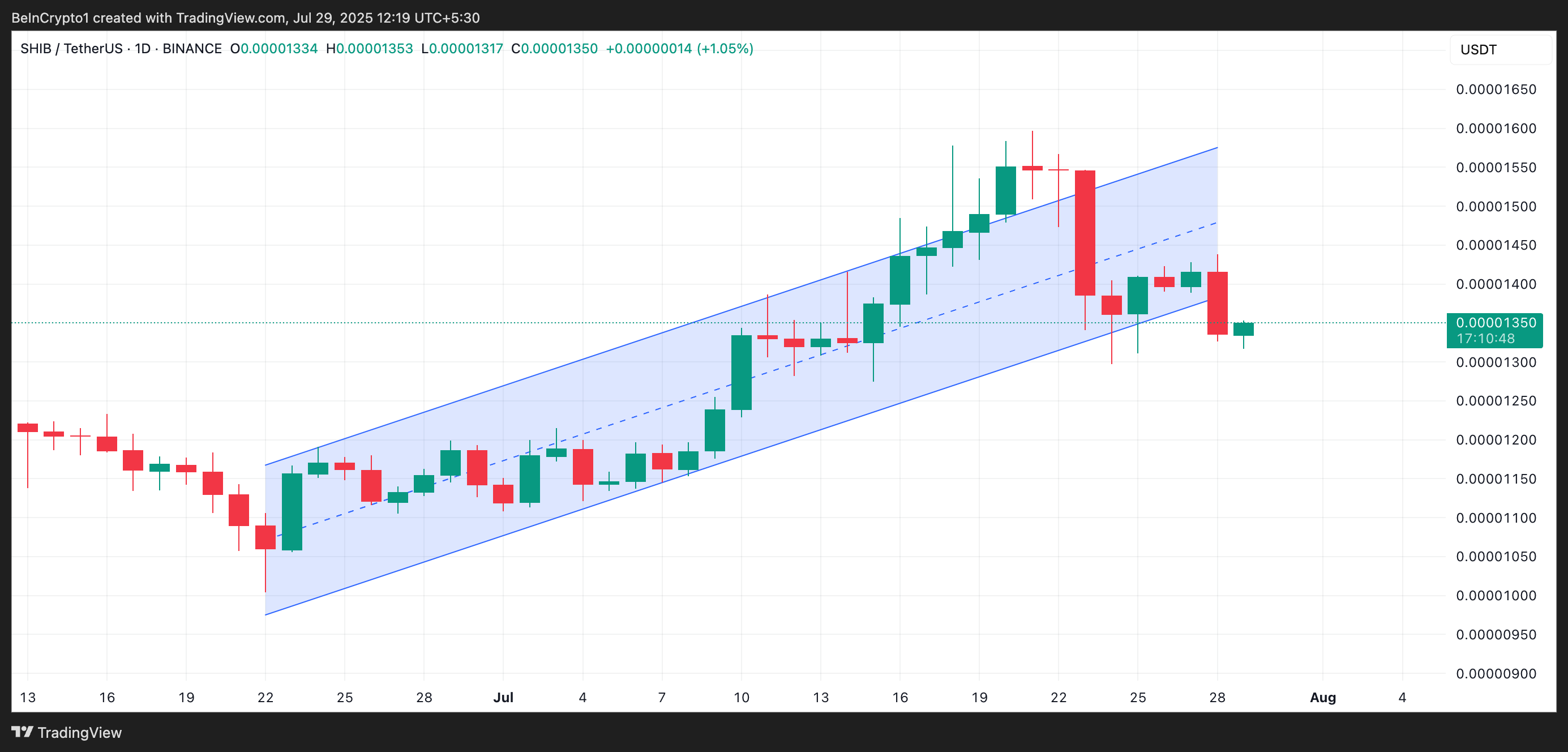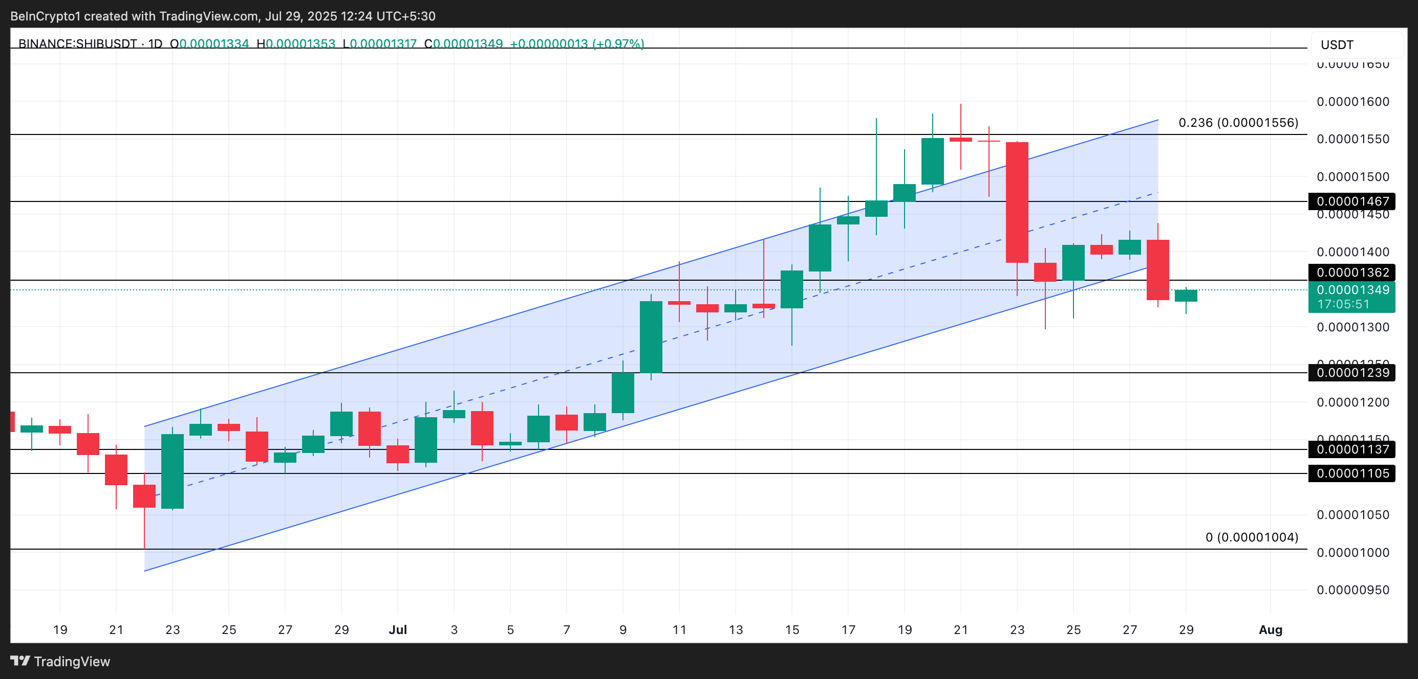 Ang nangungunang meme coin na SHIB ay bumagsak sa ilalim ng lower trend line ng ascending parallel channel kung saan ito nag-trade ng mahigit isang buwan.