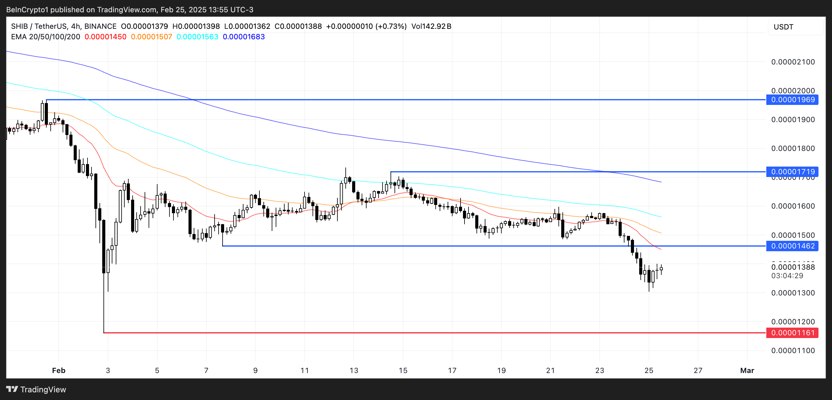 Kamakailan lang bumaba ang presyo ng Shiba Inu sa ibaba ng $0.000014 sa unang pagkakataon mula noong unang bahagi ng Pebrero, na nagpapakita ng pagpapatuloy ng bearish trend nito. Ang mga EMA lines nito ay nasa bearish setup pa rin, kung saan ang short-term EMAs ay nakaposisyon sa ibaba ng long-term ones, na nagpapahiwatig ng patuloy na selling pressure.