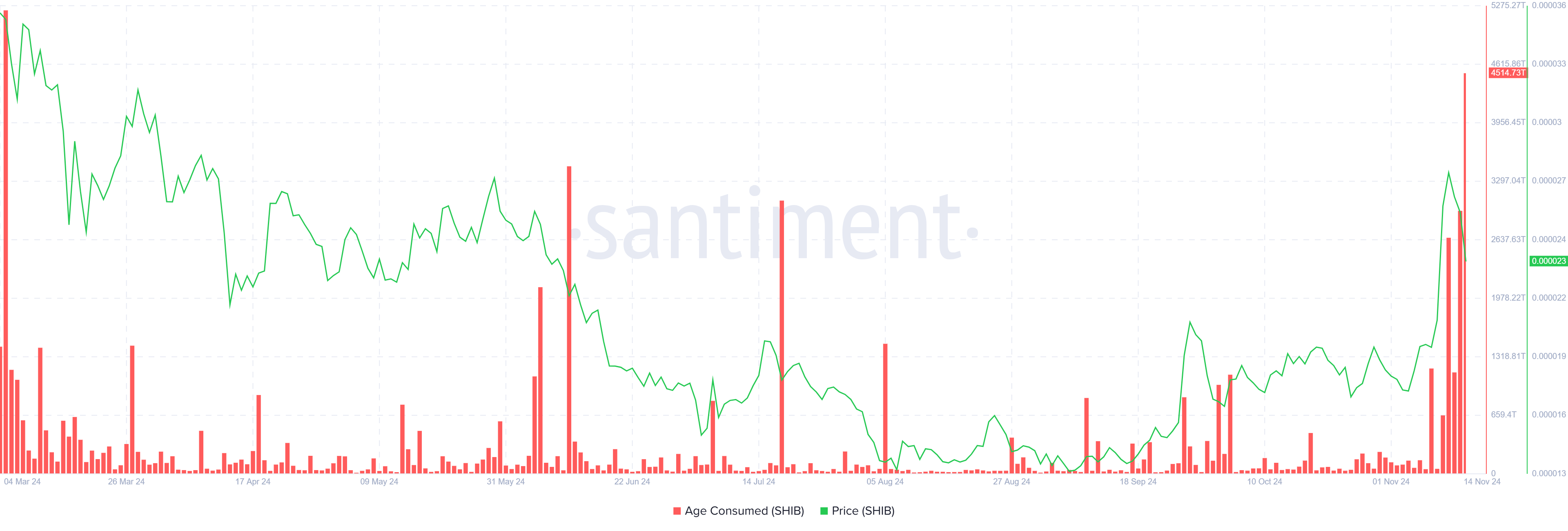 Sa nakalipas na 24 oras, ang Shiba Inu ay nagtala ng mataas na antas sa “age consumed” metric—na isang mahalagang tagapagpahiwatig para sa pagsubaybay sa galaw ng mga coins na matagal nang hawak—na umabot sa pinakamataas na antas mula noong Marso. Ang pagtaas na ito sa aktibidad ay nagpapakita ng pinakamalaking paglipat ng mga SHIB tokens na hawak ng LTHs sa huling walong buwan. Ang mga LTHs, na karaniwang bumubuo sa pundasyon ng katatagan ng merkado ng isang asset, ay mas aktibo sa paglipat ng kanilang mga tokens kaysa dati.