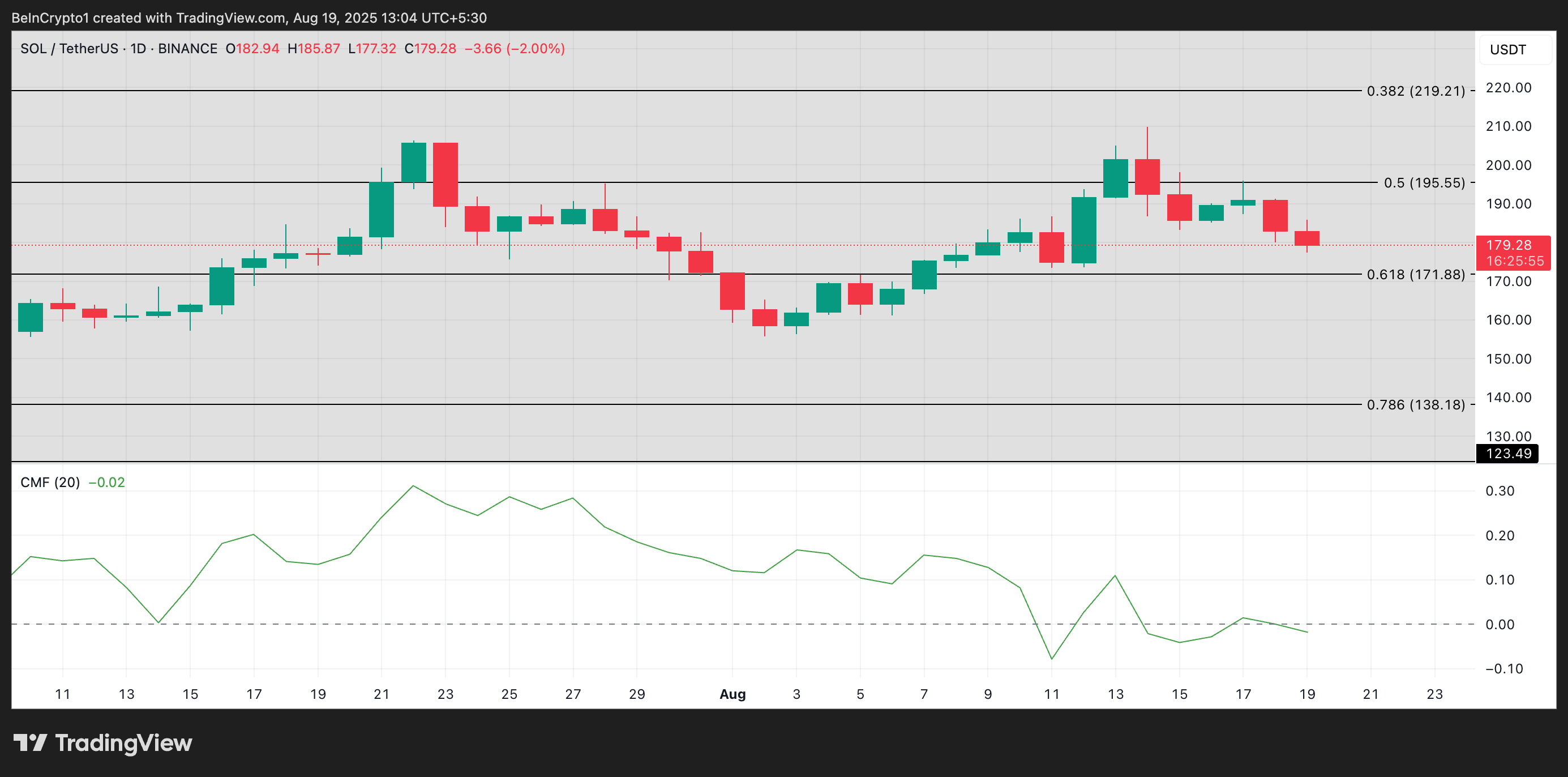 Pero may mga panganib pa rin. Ang Chaikin Money Flow (CMF) ng SOL, na sumusukat sa capital inflows, ay pababa ang trend, na nagpapahiwatig na nauubos ang liquidity. Kung walang bagong inflows, maaaring mahirapan ang anumang rebound na pinangunahan ng LTHs na makakuha ng sustained momentum.