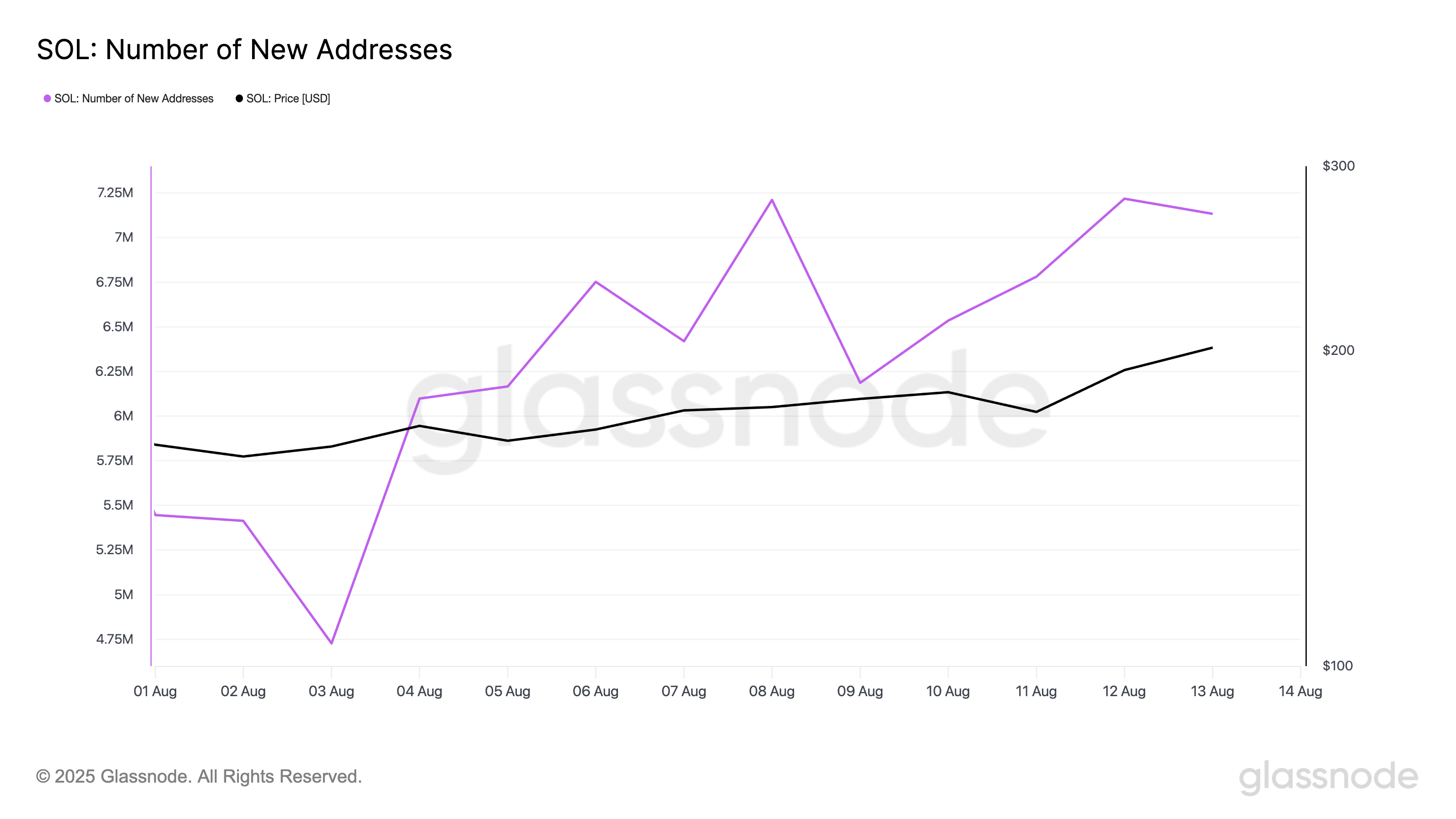 Samantala, ang bagong demand para sa SOL ay nakakita ng kapansin-pansing pagtaas sa nakaraang 14 na araw. Ayon sa Glassnode, ang bilang ng mga bagong address na sumasali sa mga transaksyon ng SOL sa unang pagkakataon ay tumaas ng 51% mula noong Agosto 3.