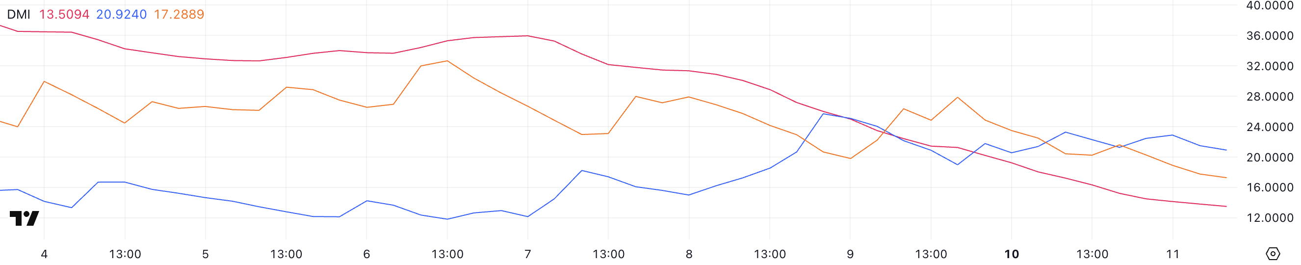 Sa pagtingin sa directional indicators, ang +DI ay nasa 20.9 at nag-fluctuate sa pagitan ng 19 at 23 sa nakaraang dalawang araw, habang ang -DI ay bumaba mula 27.8 hanggang 17.2. Ito ay nagsa-suggest na ang bearish pressure ay lubos na humina, pero ang bullish momentum ay hindi pa lumalakas nang sapat para makabuo ng malinaw na uptrend.