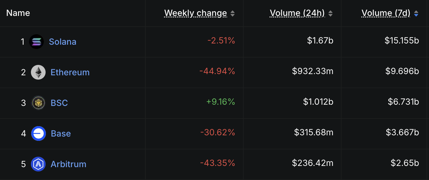 Muling nakuha ng Solana ang top spot sa lahat ng chains sa DEX volume, na nagre-record ng $15.15 billion sa nakaraang pitong araw. Ang pinagsamang total ng Ethereum, BNB, Base, at Arbitrum ay umabot sa $22.7 billion.