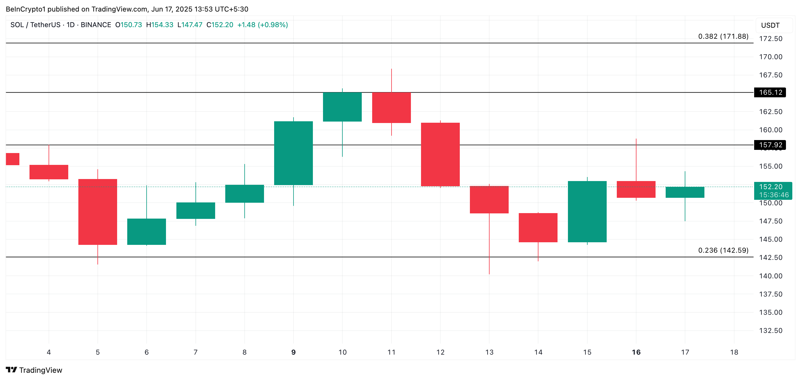 Sa kasalukuyan, ang SOL ay nagte-trade sa $152.20. Kung magpapatuloy ang pagbuo ng buying pressure, maaaring ma-break ng altcoin ang immediate resistance sa $157.92. Ang matagumpay na pag-break sa level na ito ay maaaring magbukas ng daan para sa rally patungo sa $165.12.