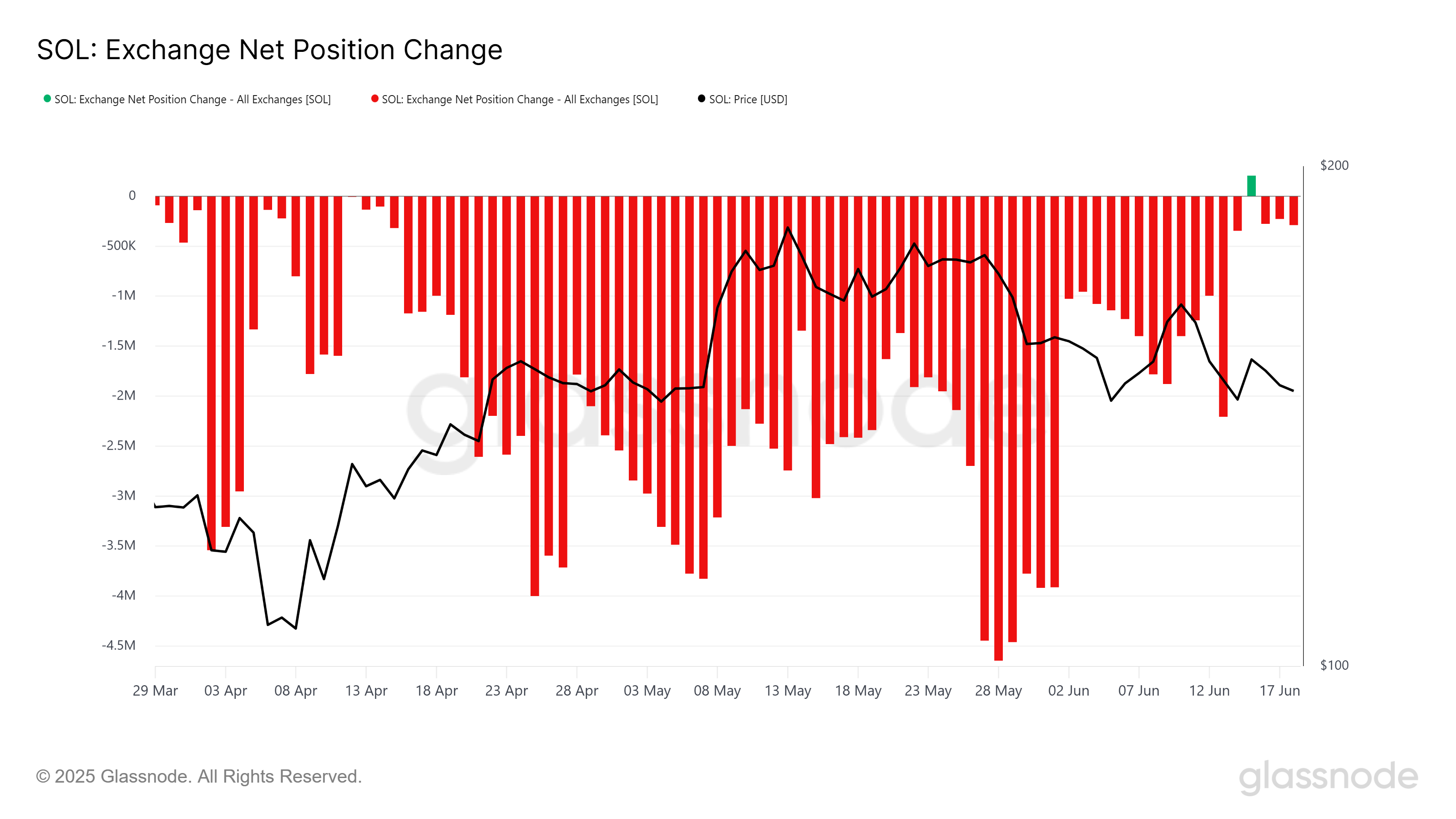 Ang market sentiment ng Solana ay nananatiling matatag, kung saan ang exchange net position changes ay nagpapakita ng trend ng accumulation sa mga investor. Sa halos tatlong buwan, isang beses lang nangyari na mas marami ang nagbenta kaysa nag-accumulate.
