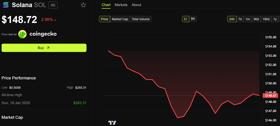 Ang hakbang na ito ay maaari ring magdulot ng pagtaas sa presyo ng Solana. Gayunpaman, sa kabila ng paglista sa DTCC, ang SOL ay nagte-trade sa $148.72 sa ngayon, bumaba ng halos 3% sa nakaraang 24 oras.