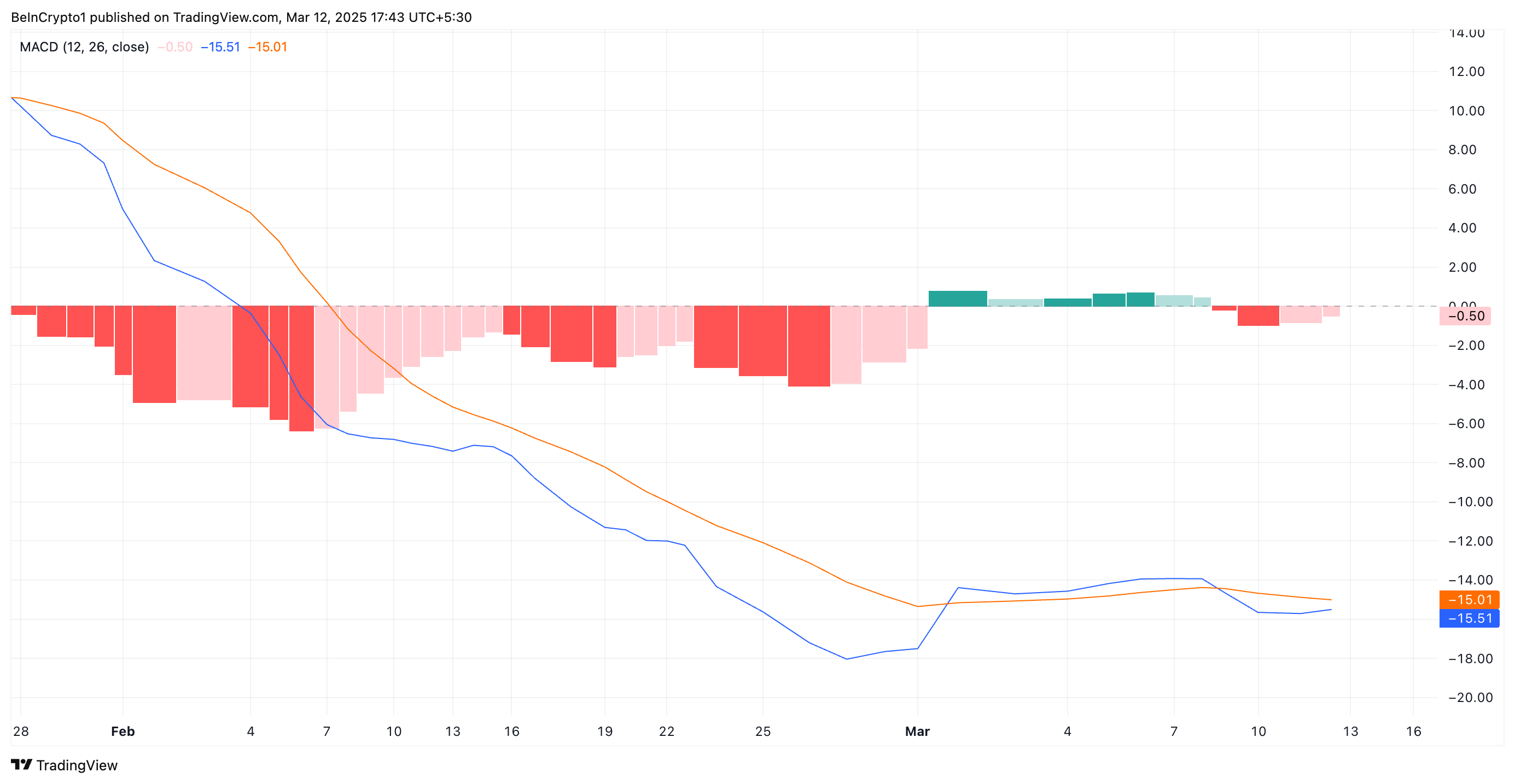 Dagdag pa rito, ang Moving Average Convergence Divergence (MACD) indicator ng SOL, na makikita sa daily chart, ay sumusuporta sa bearish outlook na ito. Sa kasalukuyan, ang MACD line ng coin (blue) ay nasa ibaba ng signal line nito (orange).