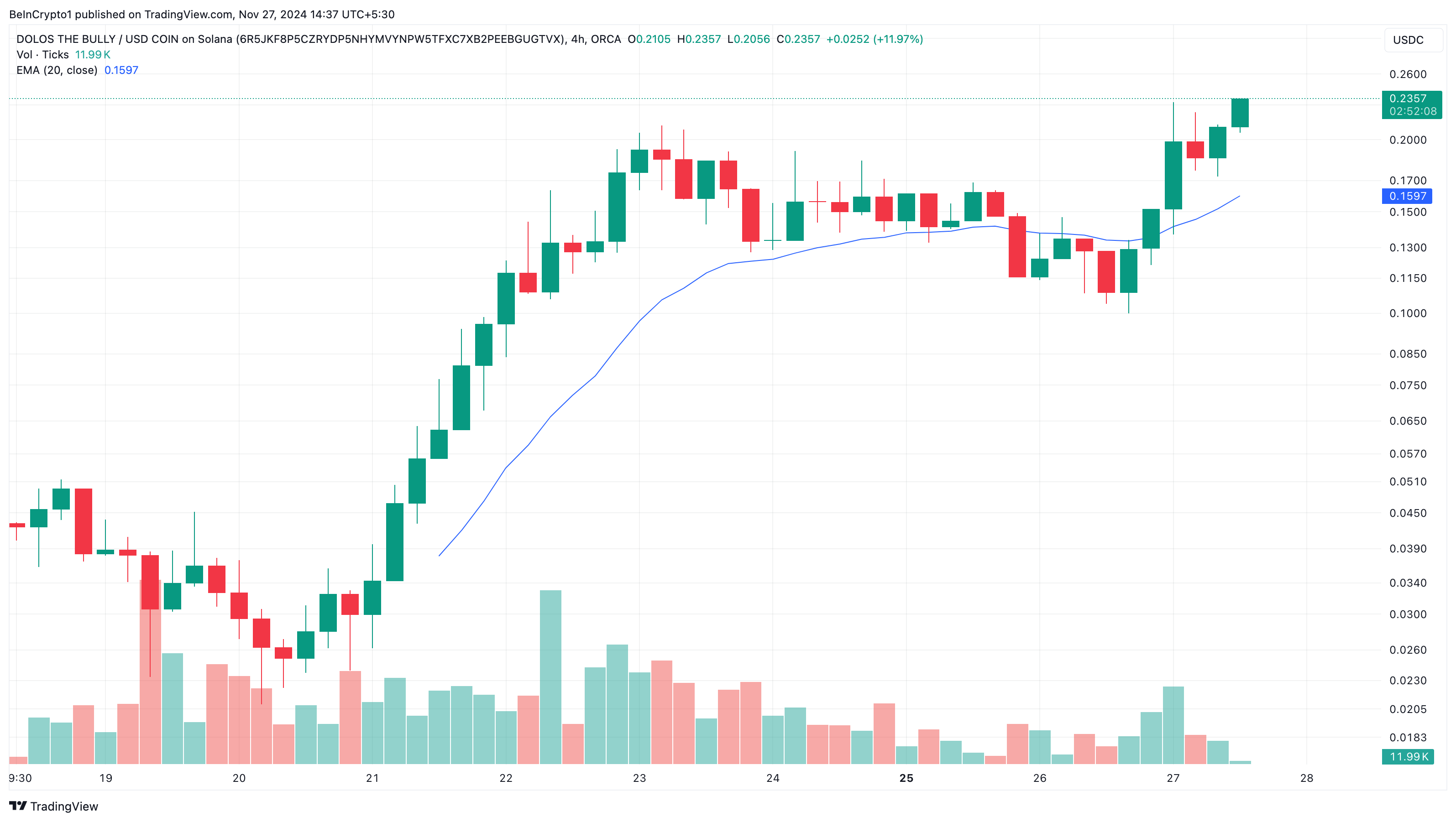 Sa 4-hour chart, ang presyo ng BULLY ay tumaas sa itaas ng 20-day Exponential Moving Average (EMA). Ang EMA ay sinusuri kung ang presyo ng cryptocurrency ay pataas o pababa.