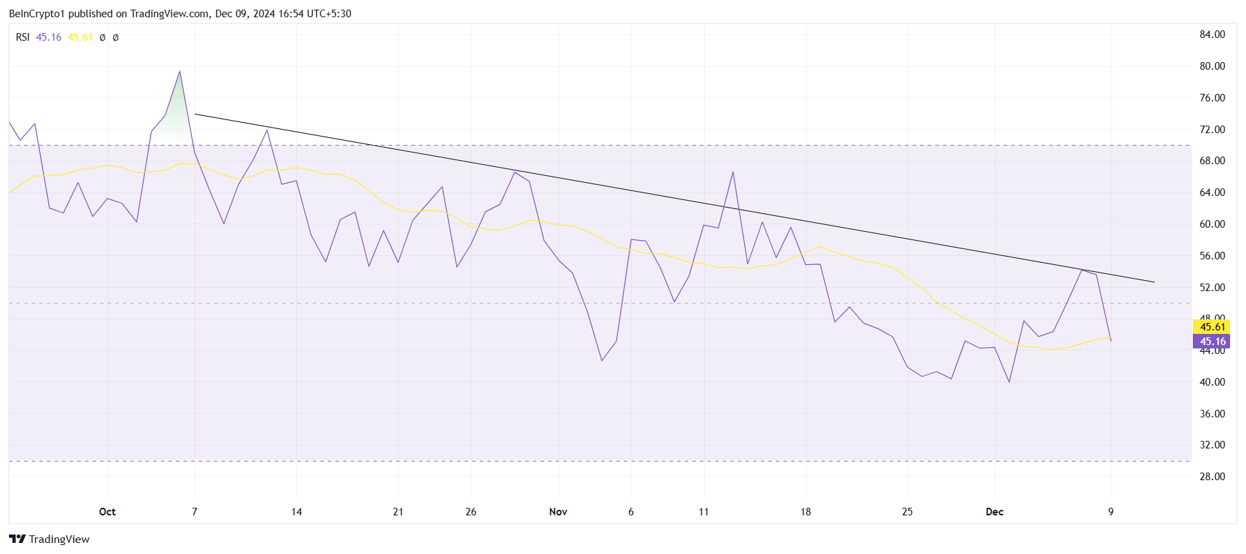 Ang overall market momentum ng POPCAT ay nagpapakita ng developing bearish trend. Ang mga key technical indicators, lalo na ang Relative Strength Index (RSI), ay nagpapahiwatig ng posibleng downturn. Sa nakaraang dalawang buwan, ang RSI ay patuloy na bumababa, na nagpapakita ng lumalakas na selling pressure. Kapag bumaba ang RSI sa neutral level na 50.0, makukumpirma na ang bearish momentum ay lumakas na.