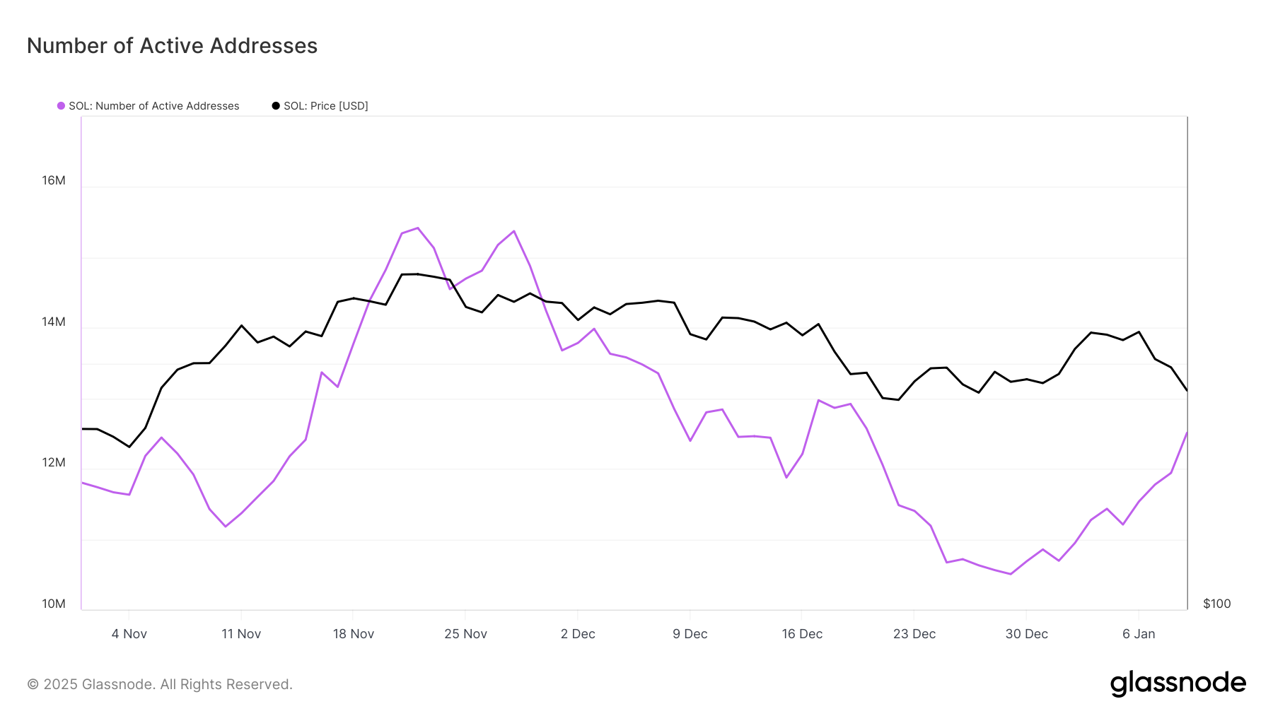 Ang bilang ng mga active address sa Solana network ay patuloy na tumataas mula simula ng taon. Sa loob ng siyam na araw, nadagdagan ng 1.5 million ang mga address na gumagawa ng transactions sa network. Ipinapakita nito na optimistic ang mga investor sa potential ng Solana na makabawi at nagpo-position sila para makinabang sa mas mababang presyo.