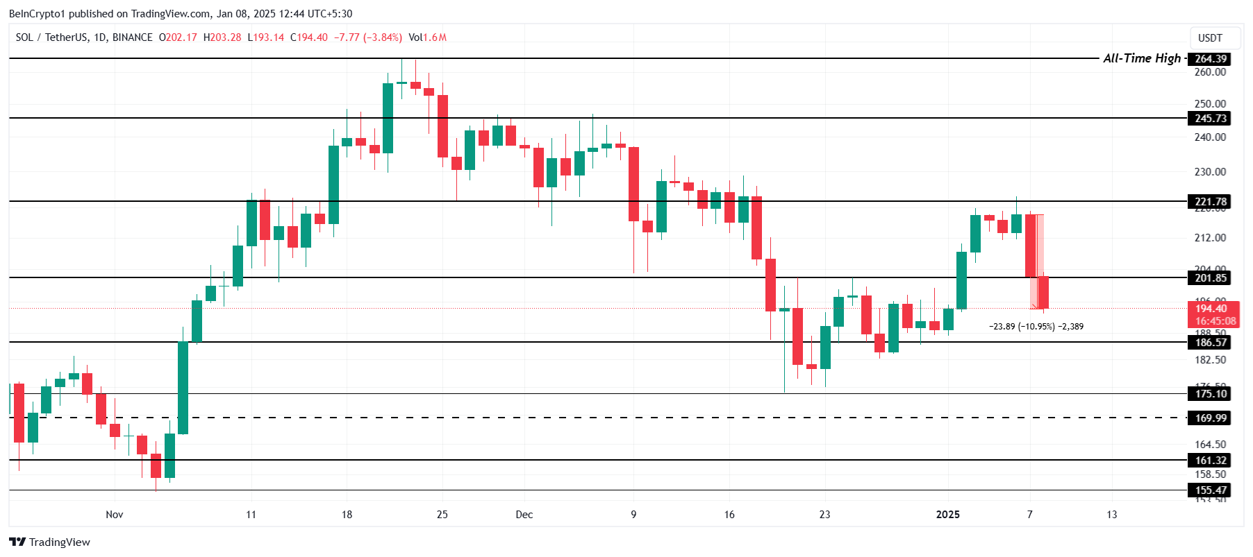 Bumaba ang presyo ng Solana ng 11% sa nakaraang 24 oras, dala ang altcoin sa $194 matapos bumaba sa ilalim ng $200 mark. Sa kabila ng pagbaba, nagawa ng Solana na manatili sa itaas ng critical support level na $186, na nananatiling mahalagang level para sa asset.