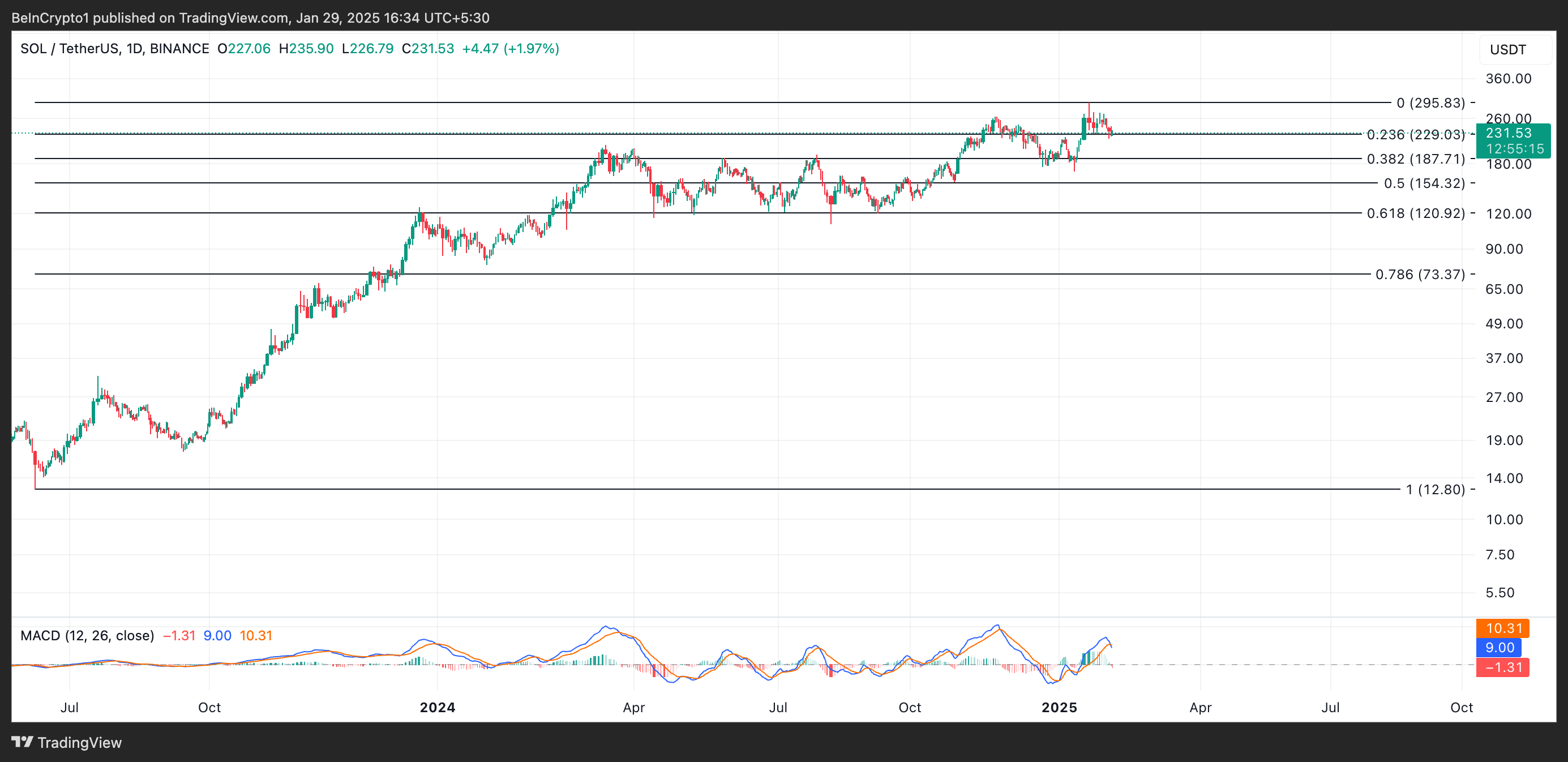 SOL ay nagte-trade sa $231.53 sa oras ng pagsulat, bumaba ng 9% ang halaga nito sa nakaraang linggo. Ang readings mula sa Moving Average Convergence Divergence (MACD) indicator nito ay nagpapakita ng humihinang demand para sa altcoin.