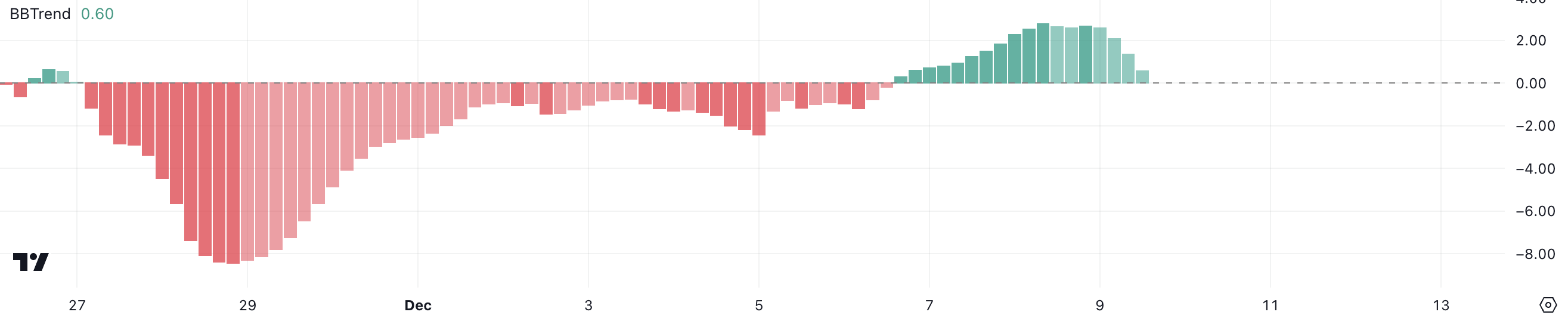Pagkatapos ng negative trend mula November 27 hanggang December 6, naging positive ulit ang Solana BBTrend at umabot sa 2.8 noong December 8.