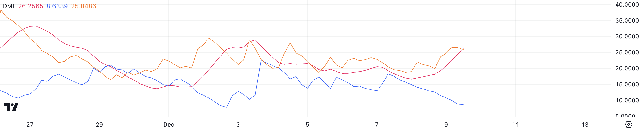 Ang ADX (Average Directional Index) ay isang technical indicator na ginagamit para sukatin ang lakas ng trend, kahit ano pa ang direksyon nito. Nagre-range ito mula 0 hanggang 100, kung saan ang mga value na higit sa 25 ay nagpapakita ng malakas na trend, habang ang mga value na mas mababa sa 20 ay nagpapahiwatig ng mahinang trend. Sa kasalukuyan, ang ADX ng SOL na nasa 26.2 ay nagpapakita na lumalakas ang trend.