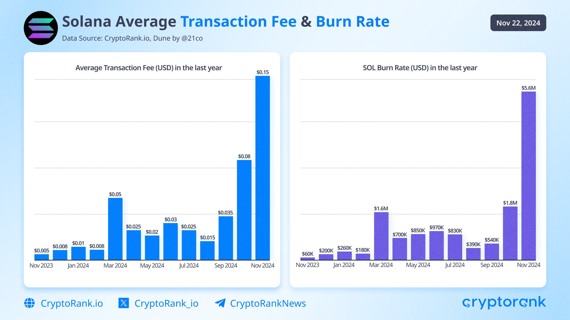 Sa mga nakaraang linggo, bumalik ang aktibidad ng meme coin, na pinalakas ng mas malawak na crypto rally na pinangunahan ng mga pangunahing asset tulad ng Bitcoin. Ang pagbabalik na ito ay nagdulot ng malaking pagtaas sa transaction volumes sa Solana, dahilan para tumaas ang fees. Ayon sa Cryptorank, umabot sa $0.15 ang transaction fees ng Solana ngayong buwan, doble sa $0.08 noong Oktubre, at ito ang pinakamataas na antas sa loob ng isang taon.