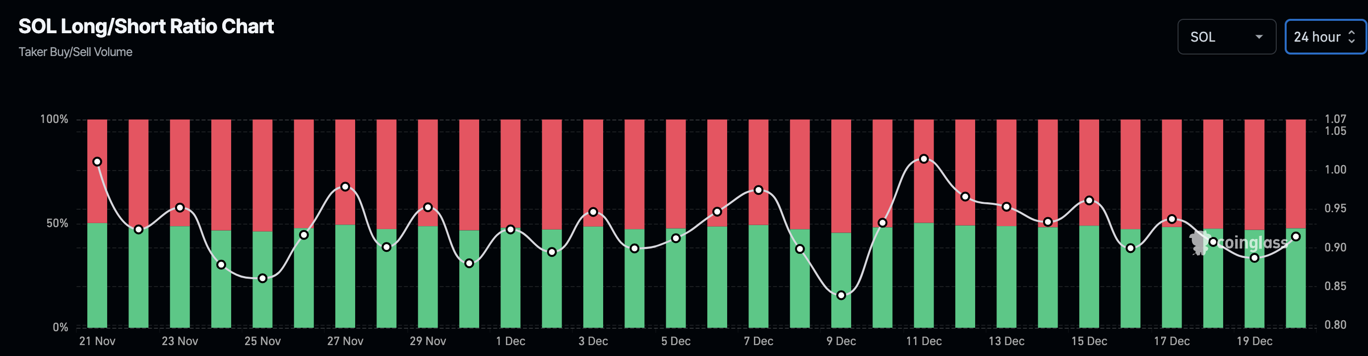 Sa pagbaba ng Solana sa ilalim ng $200, inaasahan na magiging maingat ang mga trader sa pagtaya sa pagtaas ng presyo. Pero hindi ito ang kaso. Ayon sa Coinglass, tumataas ang Solana Long/Short ratio. Ipinapakita ng Long/Short ratio kung inaasahan ng mga trader ang pagtaas o pagbaba ng presyo.