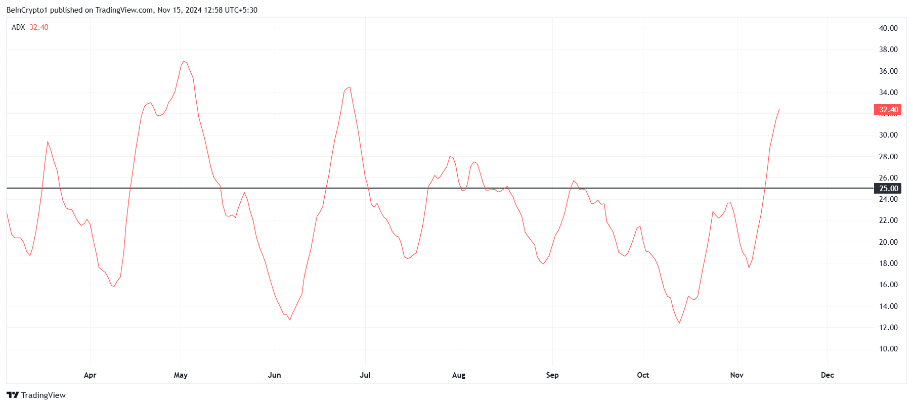 Malakas pa rin ang macro momentum ng Solana, suportado ng mga technical indicator. Ang Average Directional Index (ADX) ay nasa 32, na malayo sa threshold na 25.0, na nagkukumpirma ng malakas na uptrend. Ipinapahiwatig nito na maaaring magpatuloy ang pataas na trajectory ng Solana kung mananatiling aktibo ang mga investor.