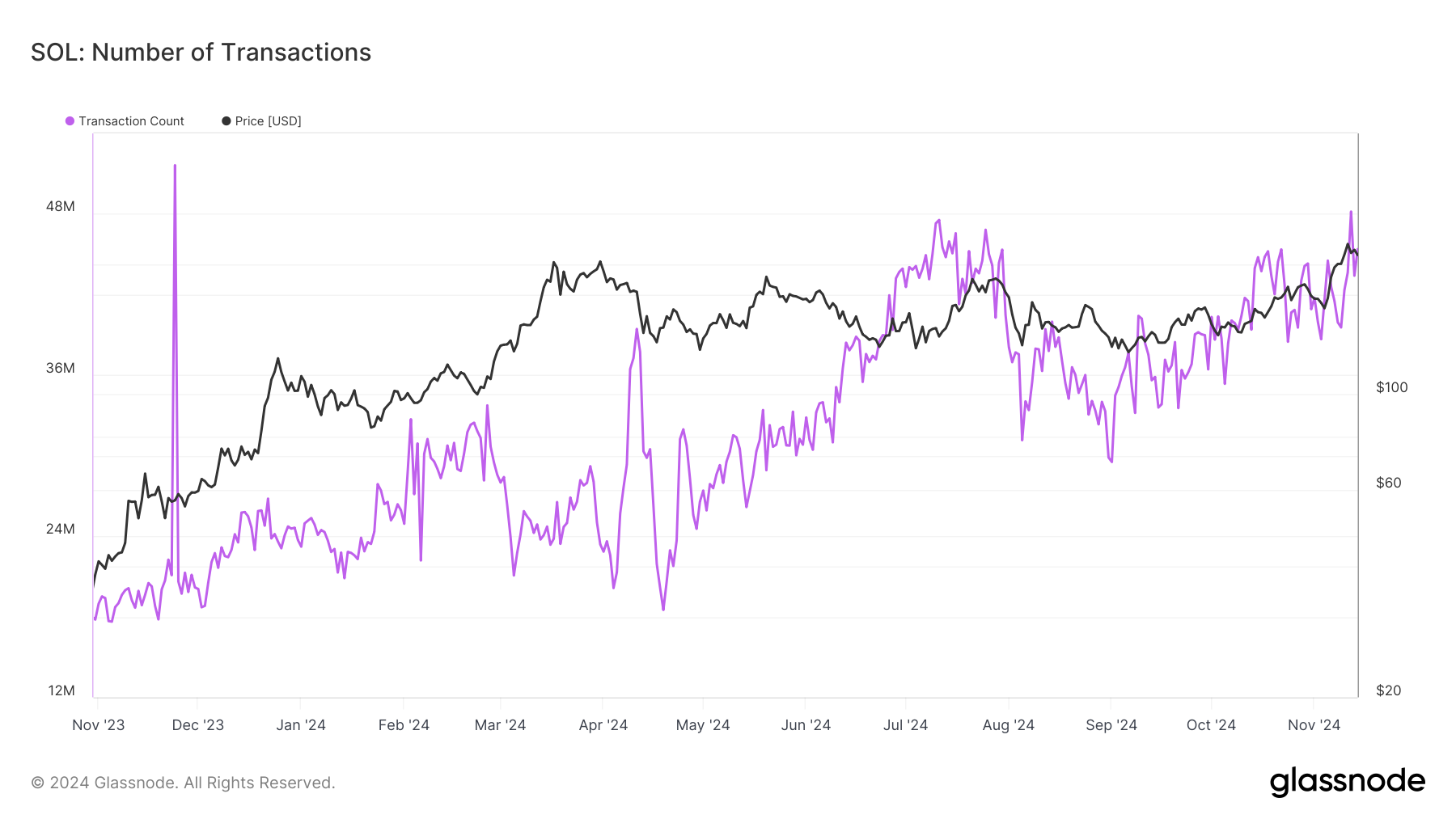 Lumaki nang malaki ang aktibidad ng transaksyon sa Solana network sa panahon ng kamakailang pagtaas ng presyo. Kamakailan, naabot ng network ang pinakamataas na bilang ng transaksyon sa isang taon, na nagpapakita ng lumalaking interes sa mga kalahok. Gayunpaman, hindi ito umabot sa inaasahan, lalo na sa kasalukuyang hype sa paligid ng Solana ETFs at mas malawak na bullish sentiment sa market.