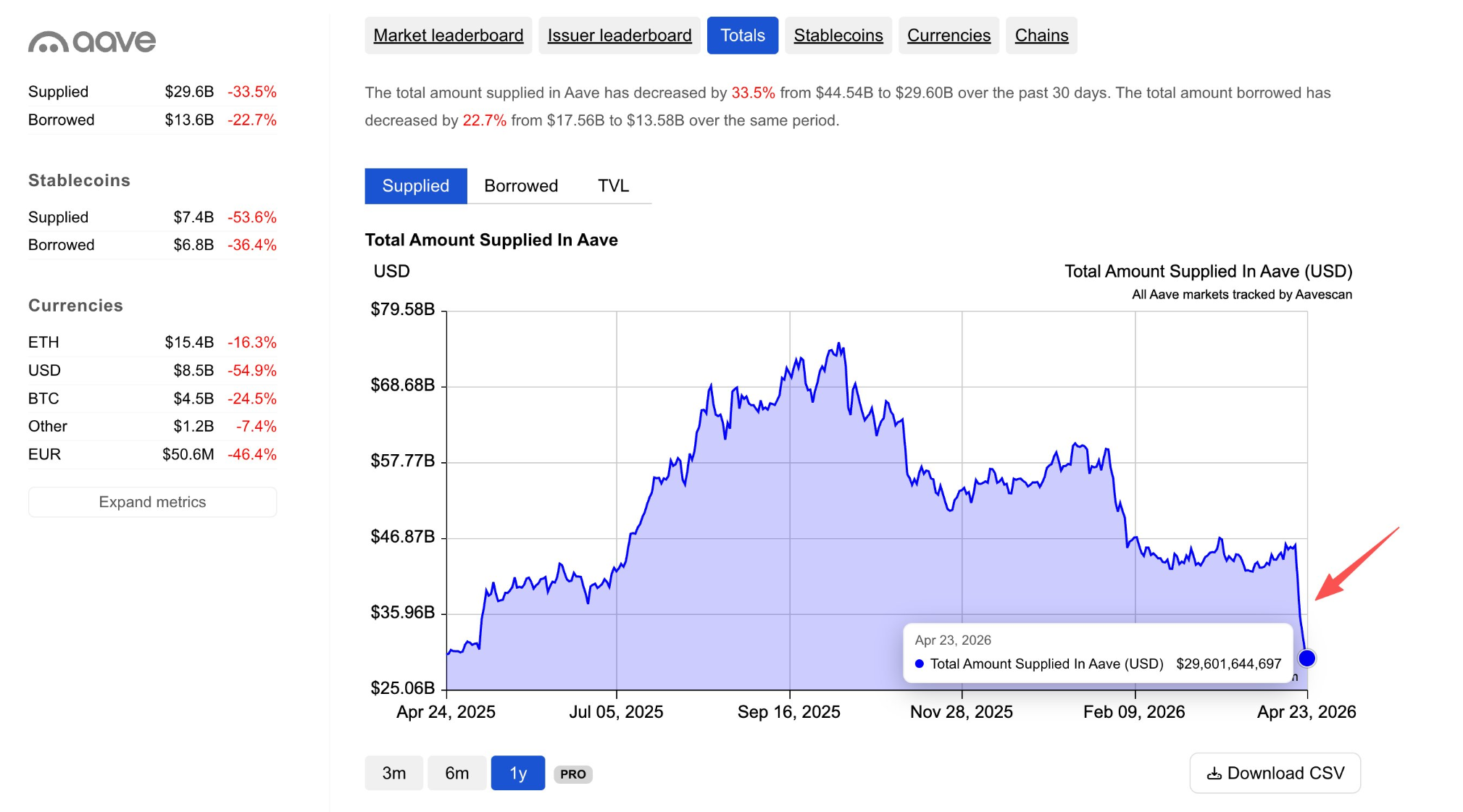Bumaba ang total deposits ng Aave mula $45.8 billion papuntang $29.6 billion, ayon kay on-chain analyst EmberCN. ‘Yung $16.2 billion na paglabas ng pondo, sunog ang mahigit isang katlo ng total deposits sa protocol.