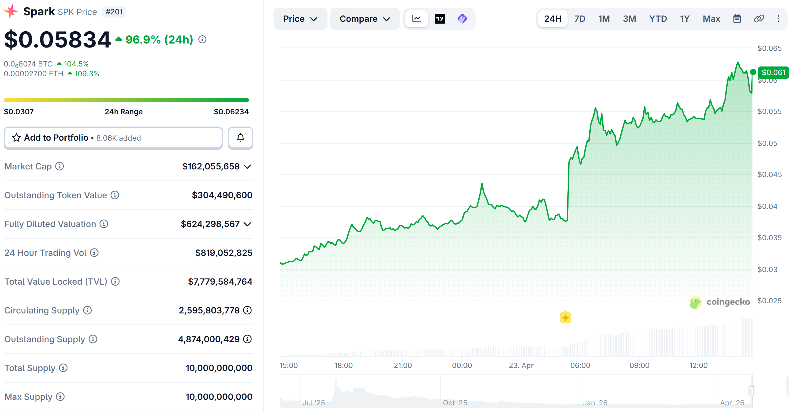 Ngayon, nagtitrade ang SPK sa $0.05834, na may 96.9% na pag-akyat sa huling 24 oras.