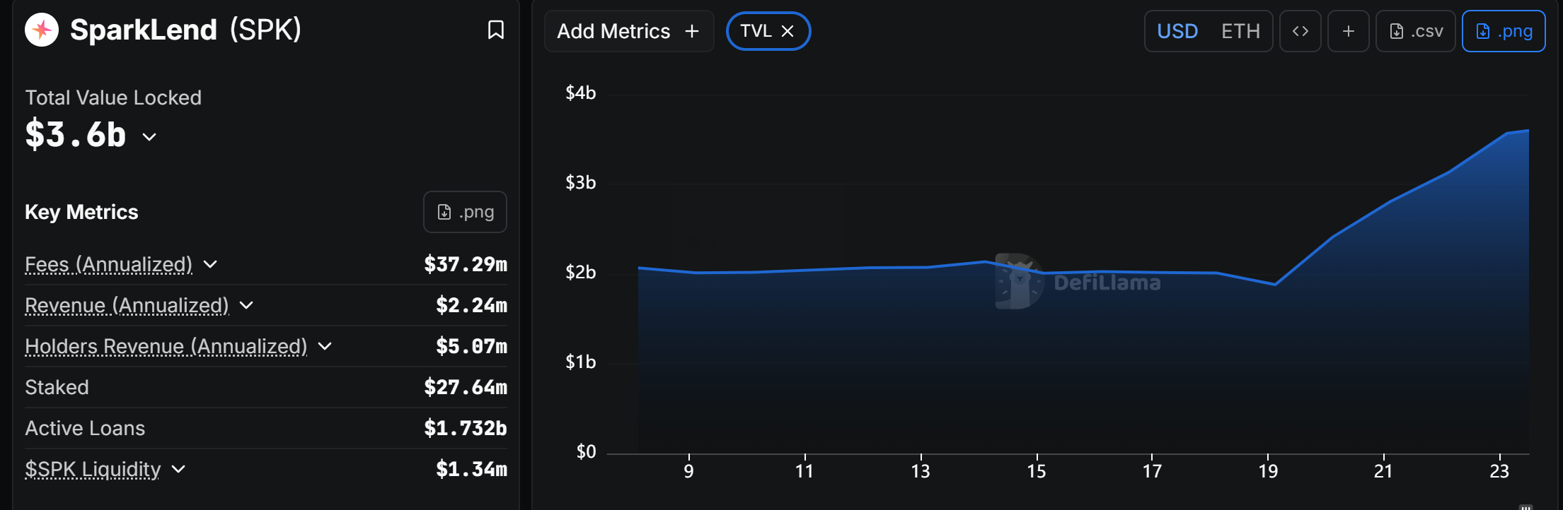 Umabot mula nasa $1.89 billion hanggang $3.6 billion ang total value locked ng SparkLend simula April 18. Ibig sabihin, mahigit $1.7 billion na bagong deposito ang pumasok sa loob lang ng limang araw, ayon sa DefiLlama data.