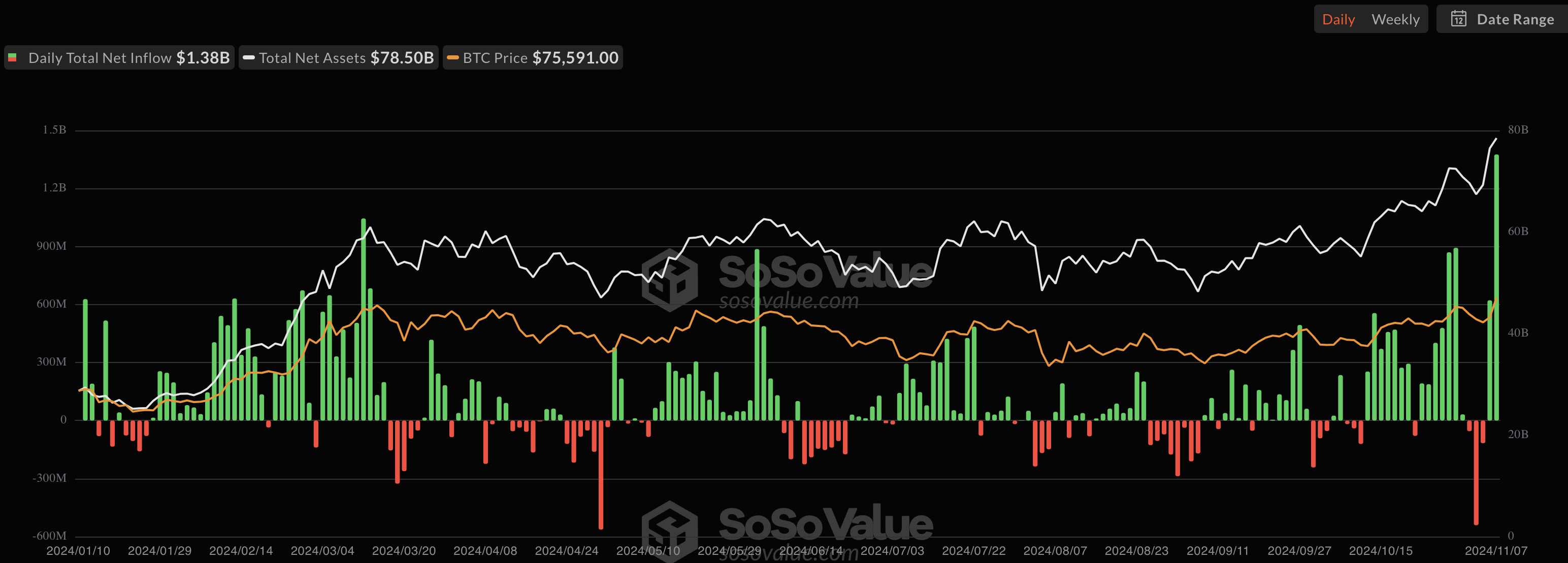 Ayon sa SoSo Value, isang provider ng crypto data, ang net inflow ng Bitcoin ETFs noong November 6 ay $621.90 million, malaking pagtaas ito kumpara sa mga nakaraang tatlong araw.