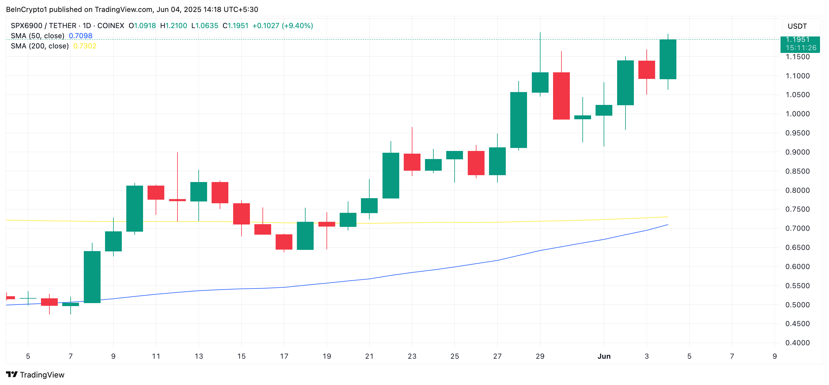 Ang SPX token ay malapit nang makabuo ng golden cross, kung saan ang 50-day simple moving average (SMA) nito ay nakatakdang lumampas sa 200-day SMA.