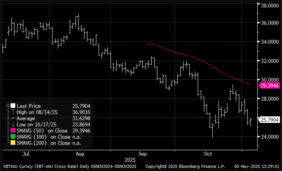 - Ang natitirang (50%) kapag ang Bitcoin–gold ratio ay umakyat sa itaas ng 30.