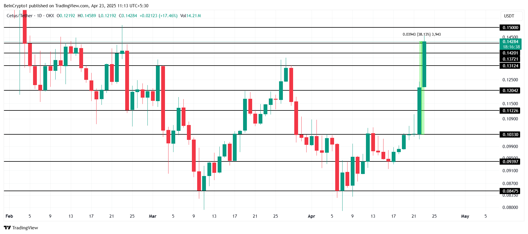 Tumaas ang presyo ng CETUS ng 38% sa nakalipas na 24 oras, umabot sa two-and-a-half-month high na $0.142. Ang malaking pag-angat na ito ay nagpapakita ng malakas na momentum para sa altcoin. Sa puntong ito, layunin ng CETUS na manatili sa ibabaw ng $0.142, na magiging matibay na support level para sa posibleng karagdagang pag-angat.