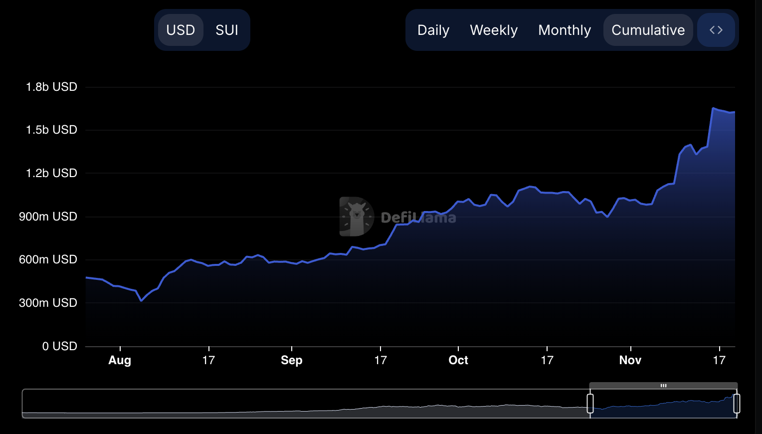 SUI Total Value Locked (TVL) ay patuloy na tumataas, umabot ito sa $1.65 billion noong November 15. Pero, bahagyang bumaba ito mula noon, at nanatili sa paligid ng $1.62 billion nitong mga nakaraang araw.